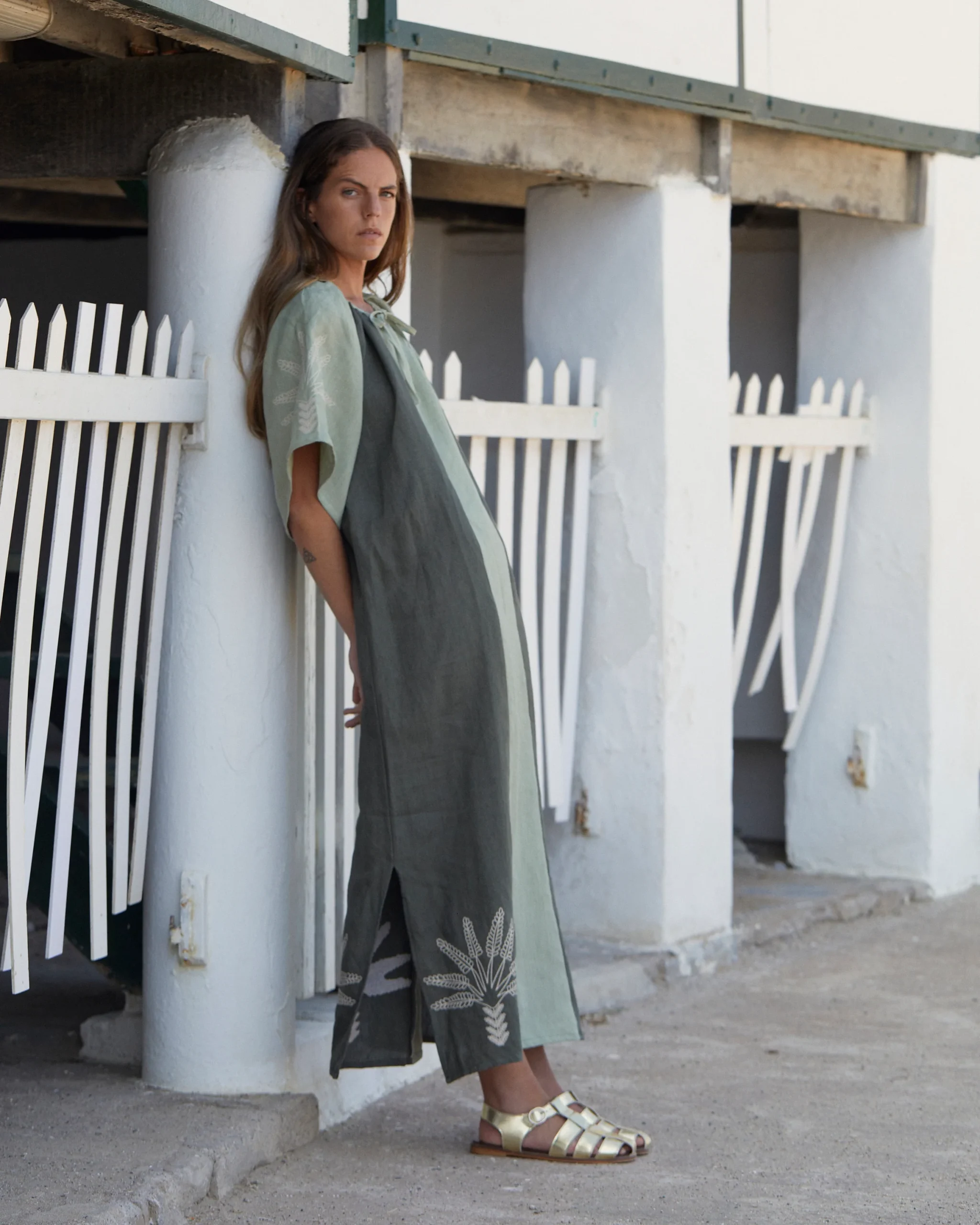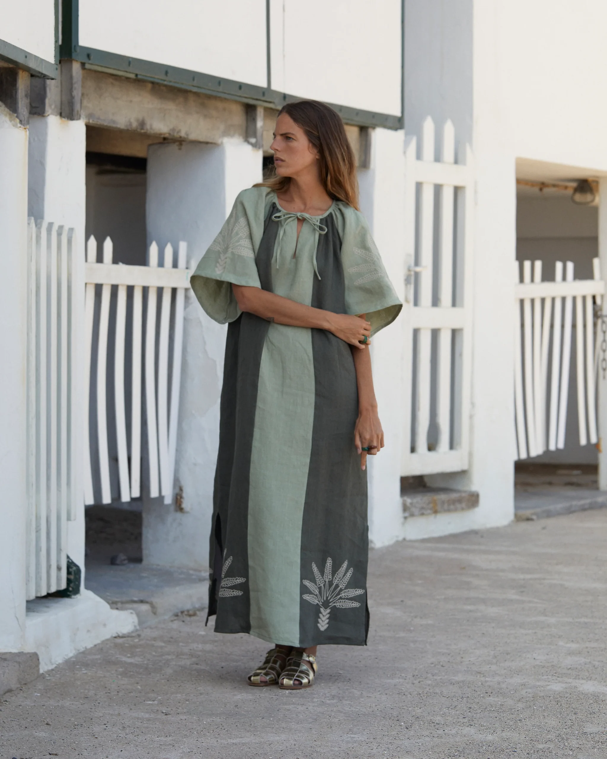 Vestido con cuello redondo fruncido con lazo y falda con doble abertura está confeccionado en un tejido de rayas verdes y grises 100% lino. Bordados florales en mangas y bajos.