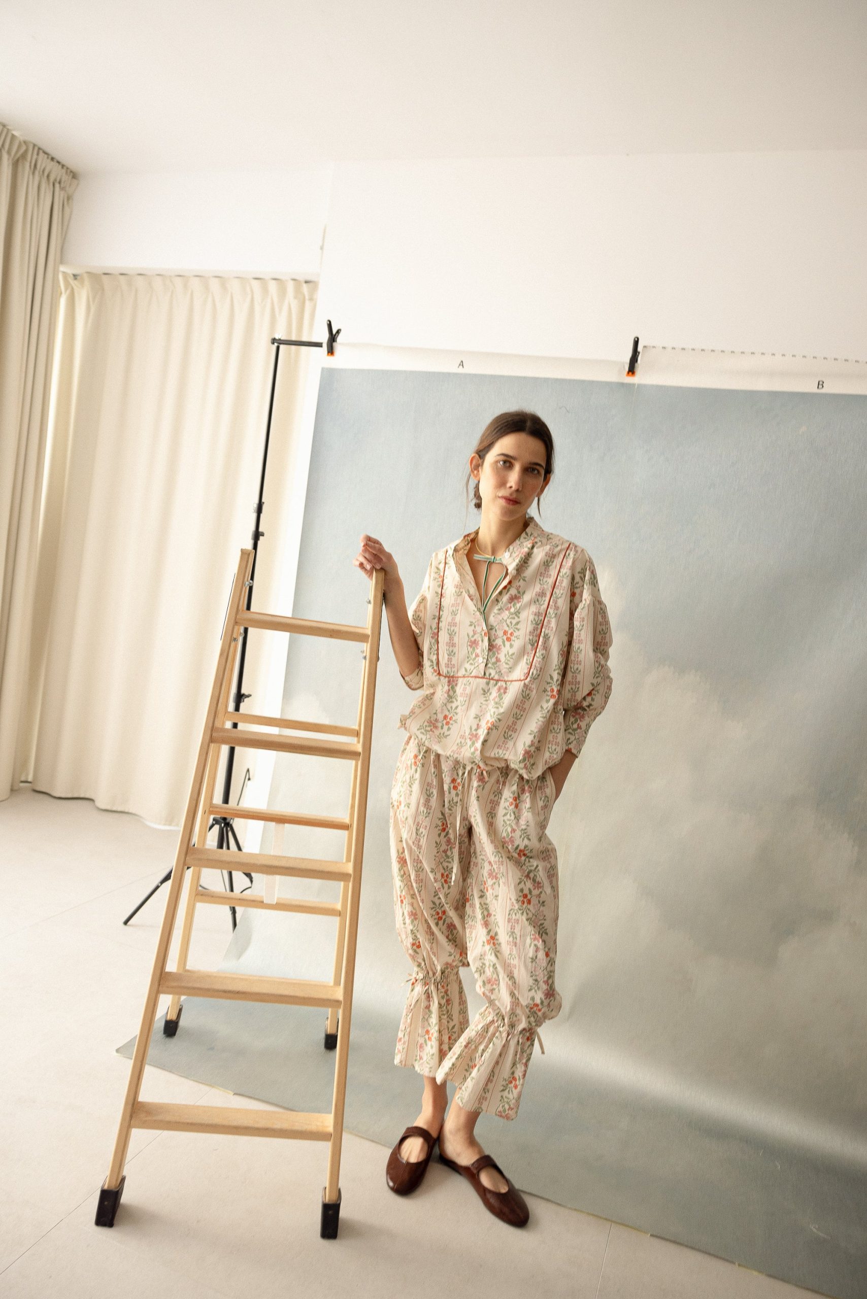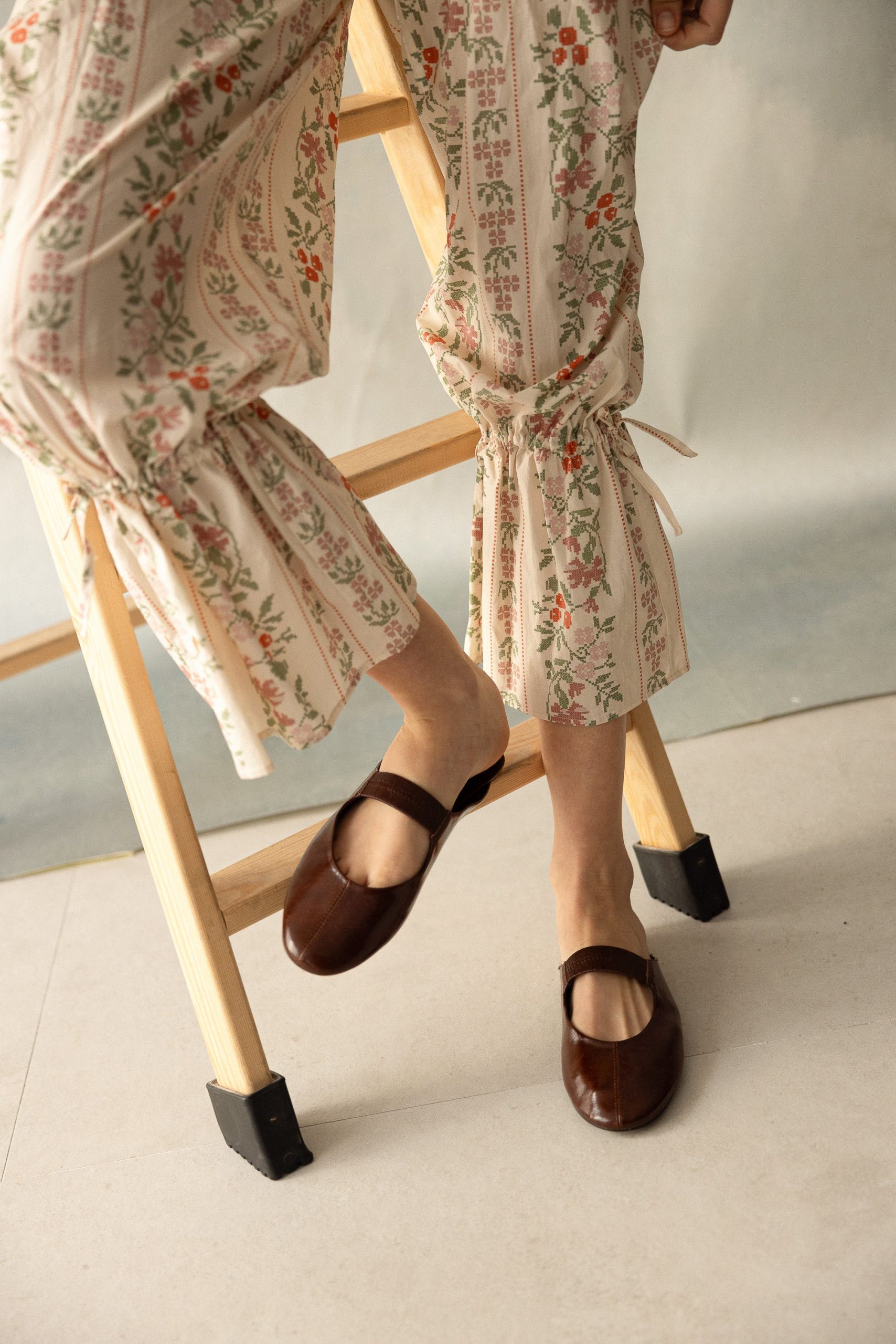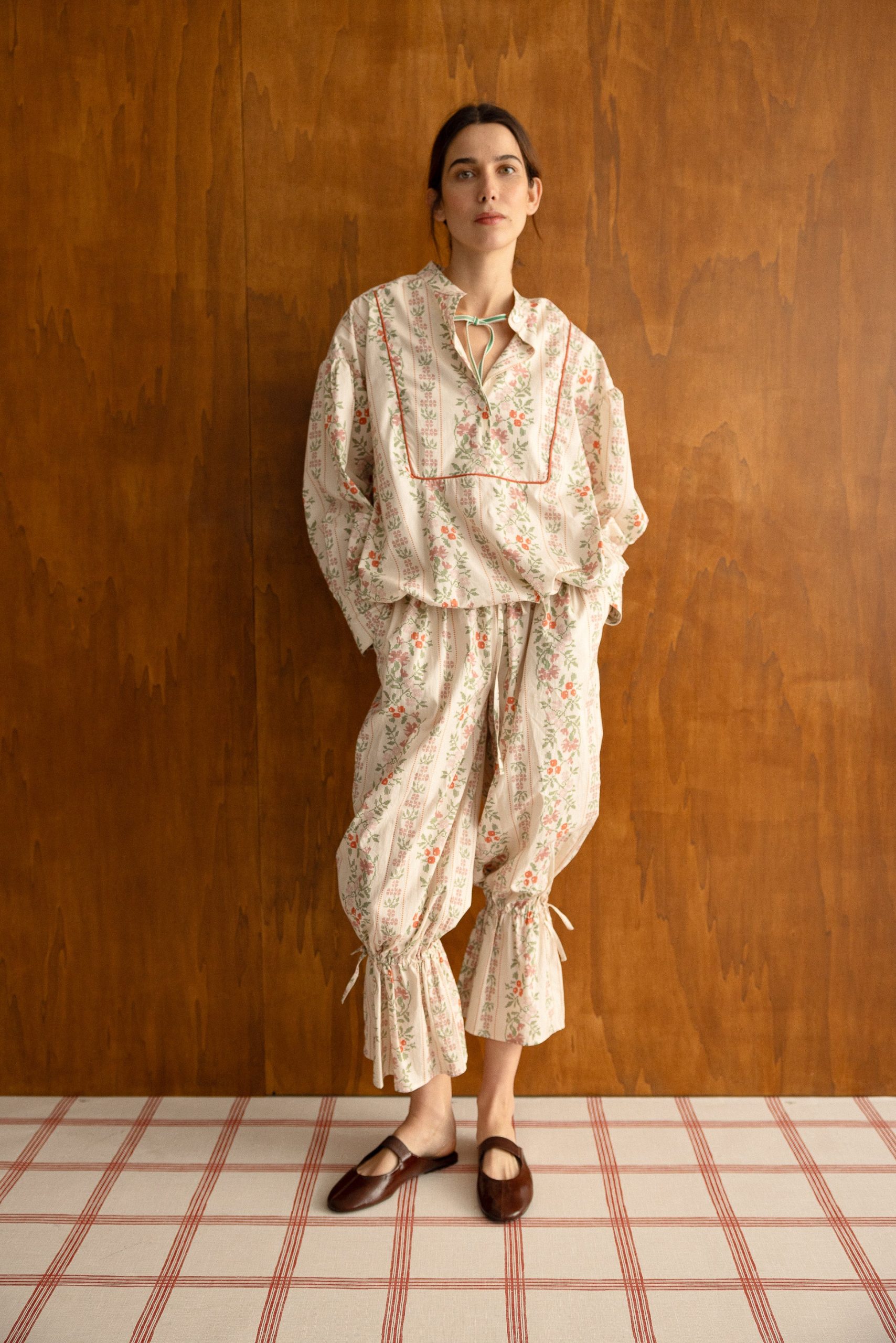 Pantalón fluido con estampado floral y bajo fruncido. Su diseño combina un delicado estampado en tonos cálidos sobre fondo claro. El bajo ajustado aporta volumen y movimiento, creando una silueta favorecedora y especial.