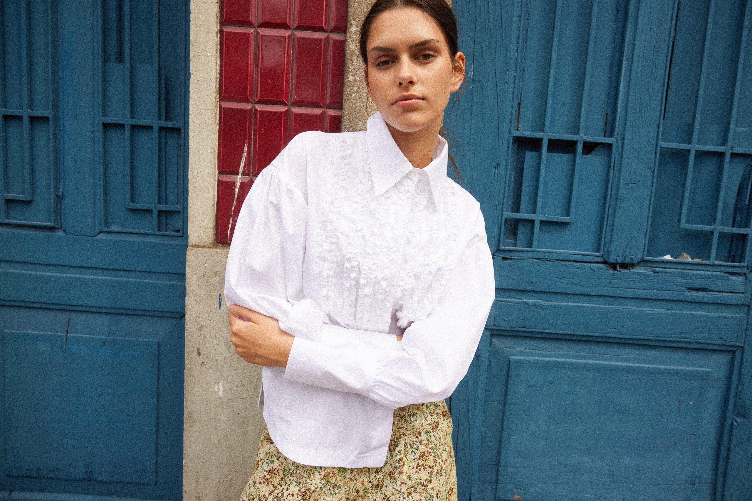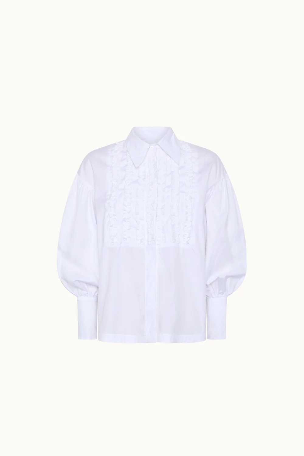 Camisa confeccionada en un tejido blanco 100% algodón. Pecho adornado con volantes. Mangas abullonadas y puños grandes.