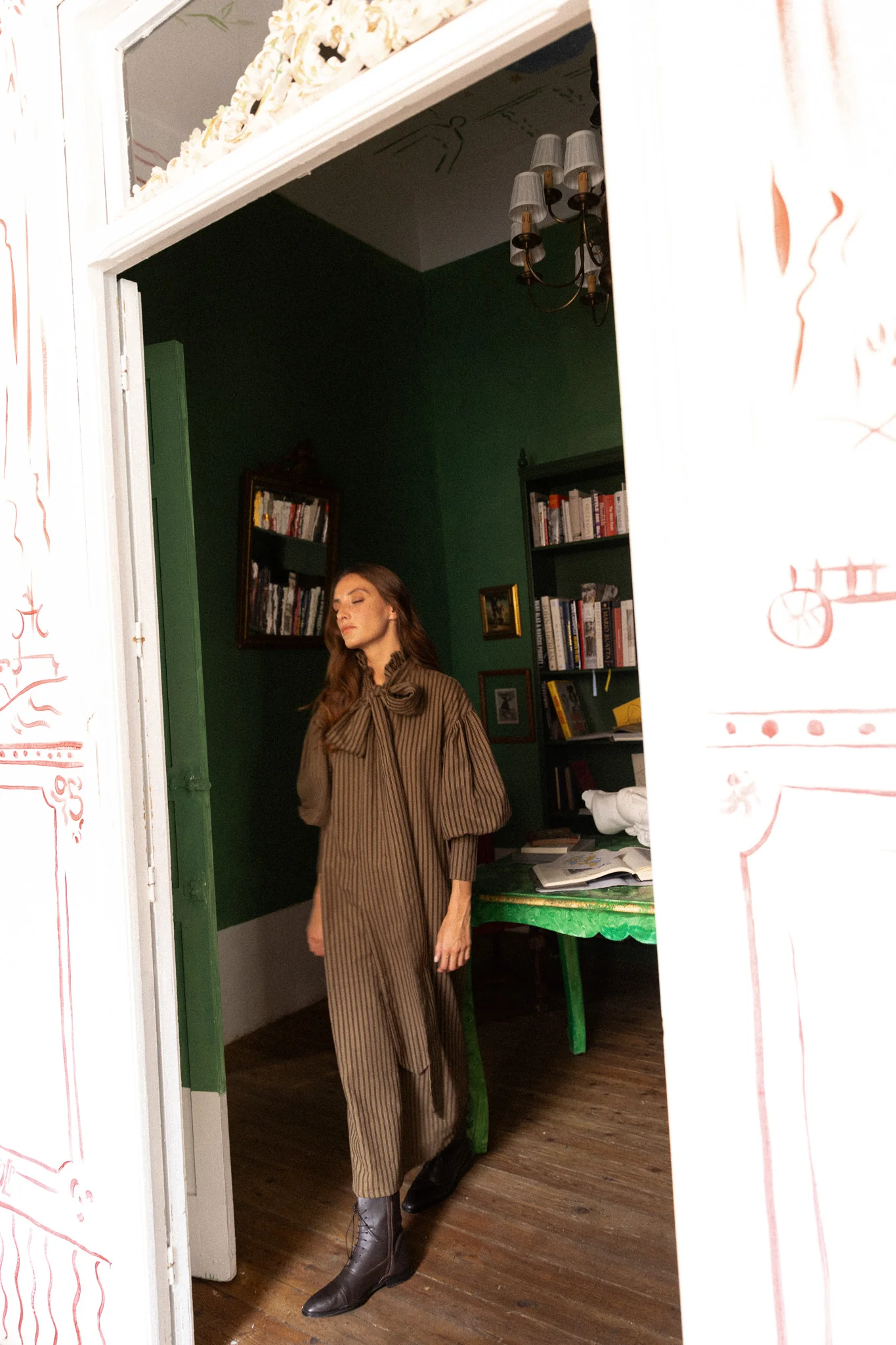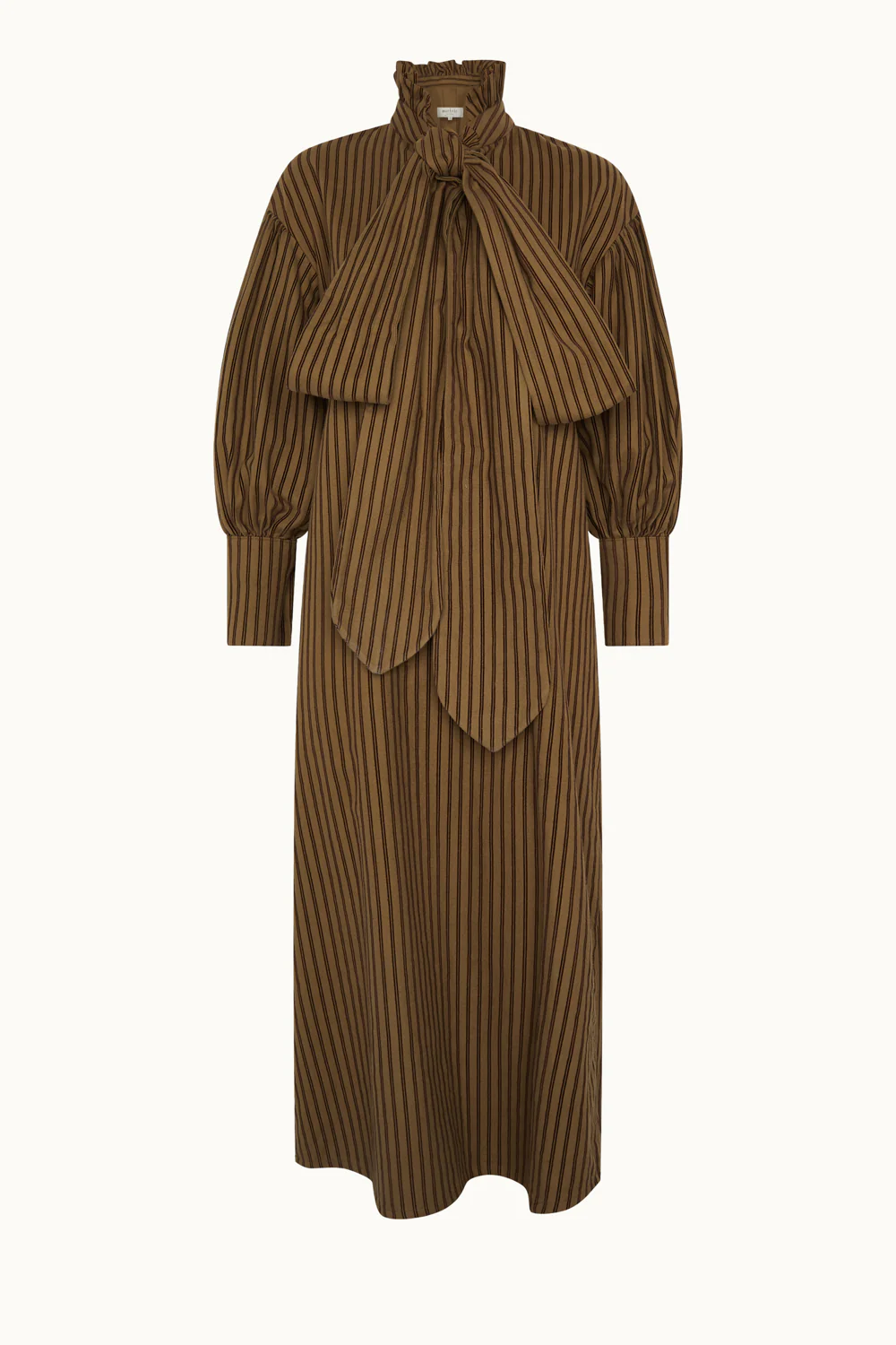 Vestido a rayas marrón confeccionado en 100% algodón. Cuello cerrado con un lazo y mangas abullonadas acabadas en puños. Este vestido se convierte en una pieza única y atemporal.