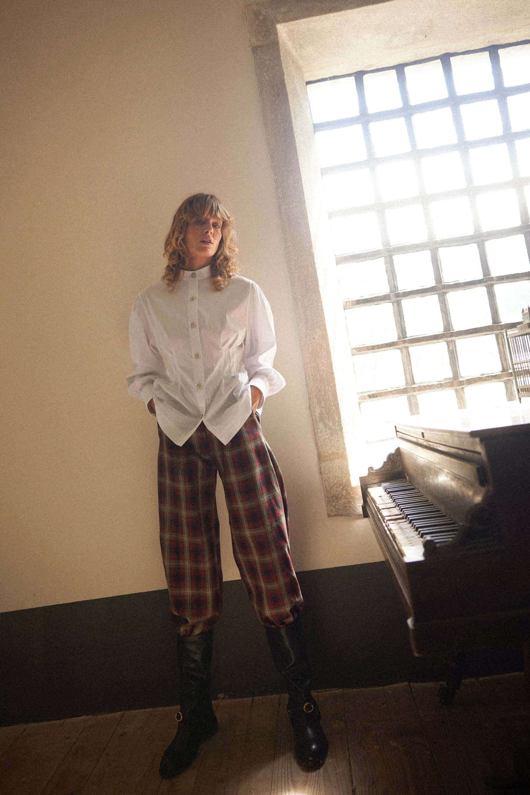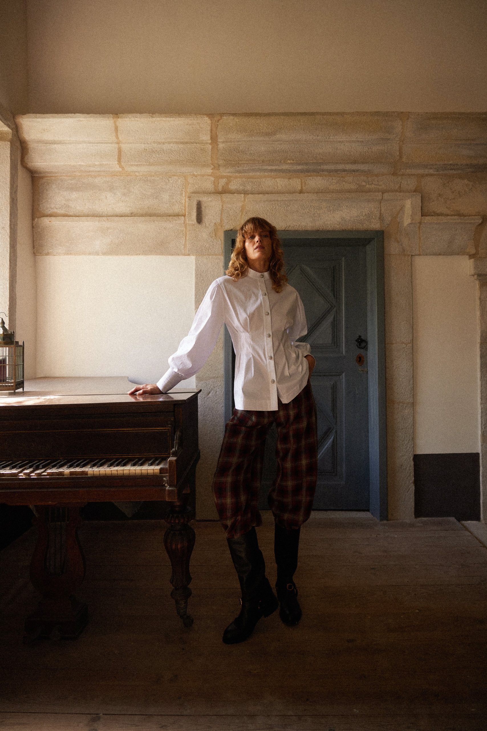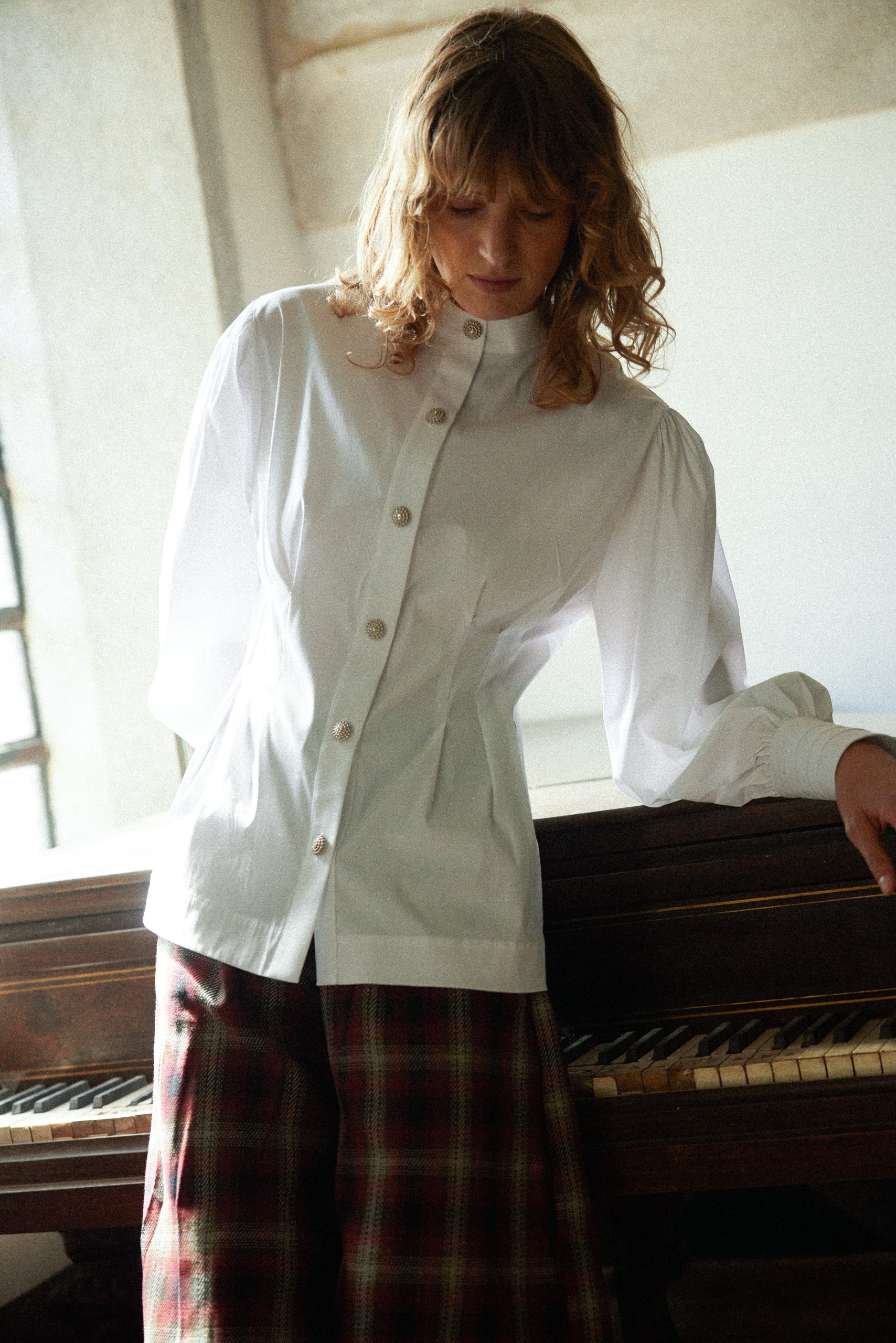 Camisa blanca con botones joya. Cintura ceñida, cuello mao y mangas abullonadas.