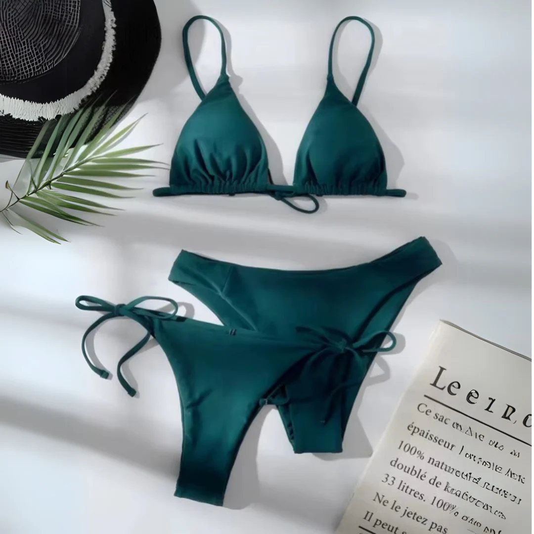 Top de bikini: Diseño triangular ajustable con tiras para amarrar, lo que permite un ajuste perfecto y realce del busto.