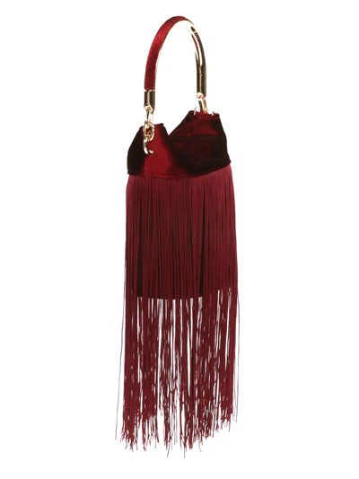 Bolso de fiesta de raso y terciopelo. Mide 14 X 18 X 8 cm. Tiene cadena para poder llevar colgado del hombro y va adornado con flecos