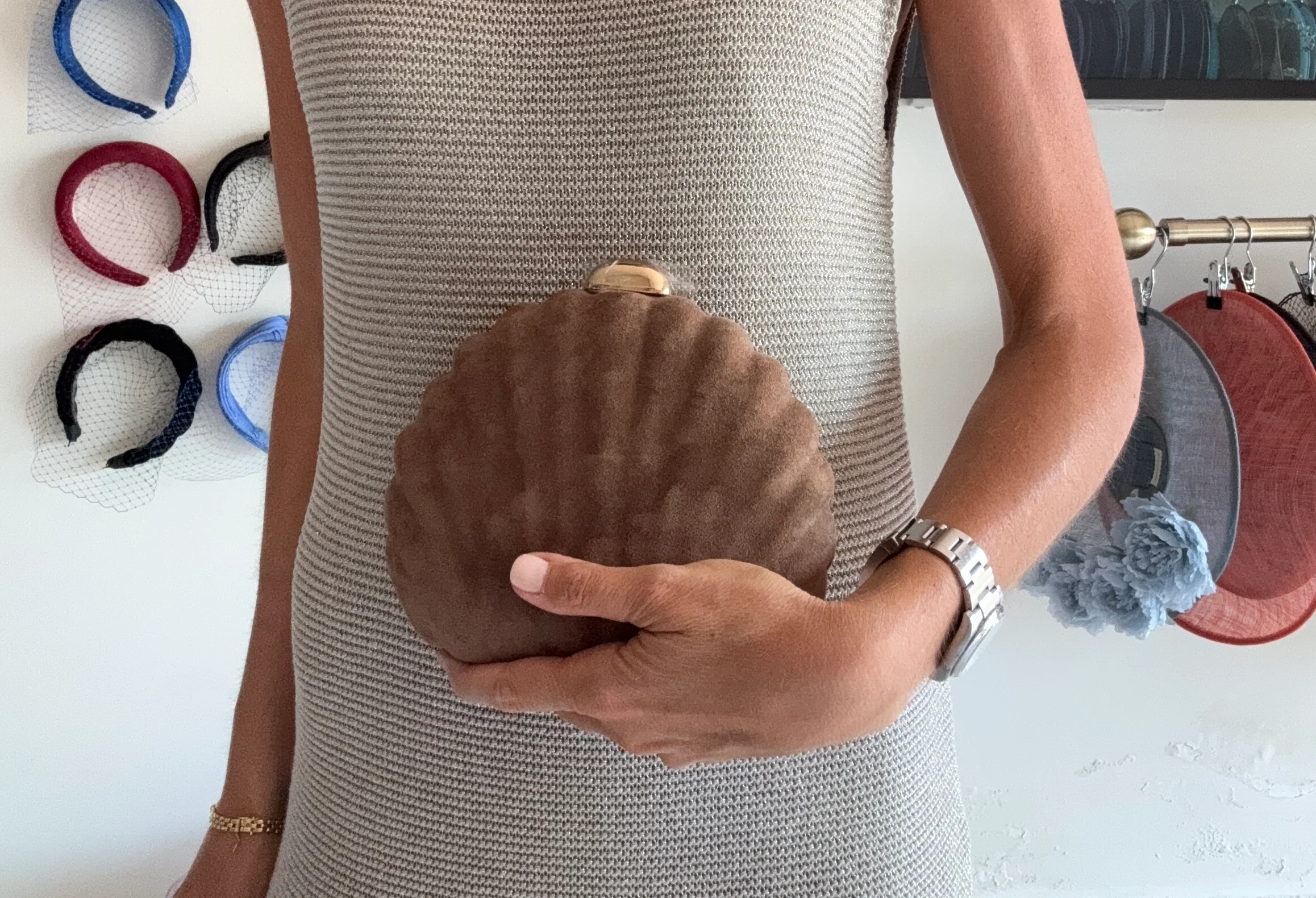 Bolso de fiesta de antelina camel. Tiene forma de concha Mide 18 x 16 cm. Tiene cadena para poder llevar colgado del hombro.