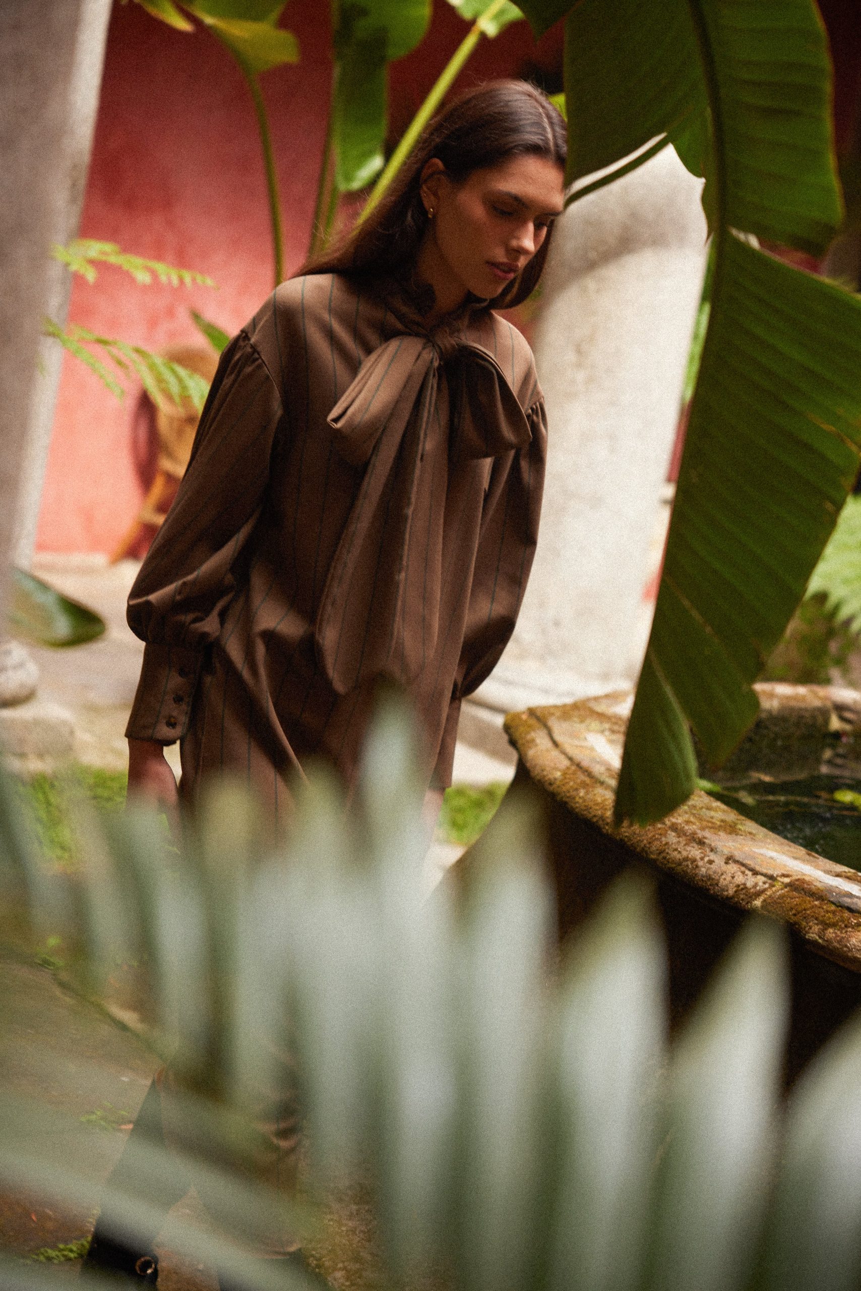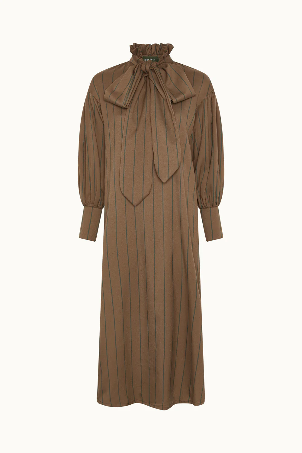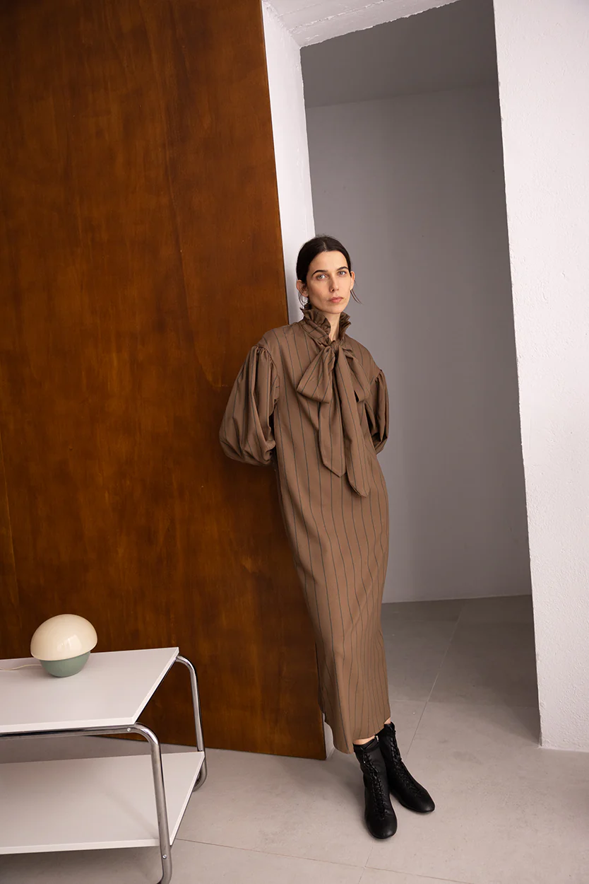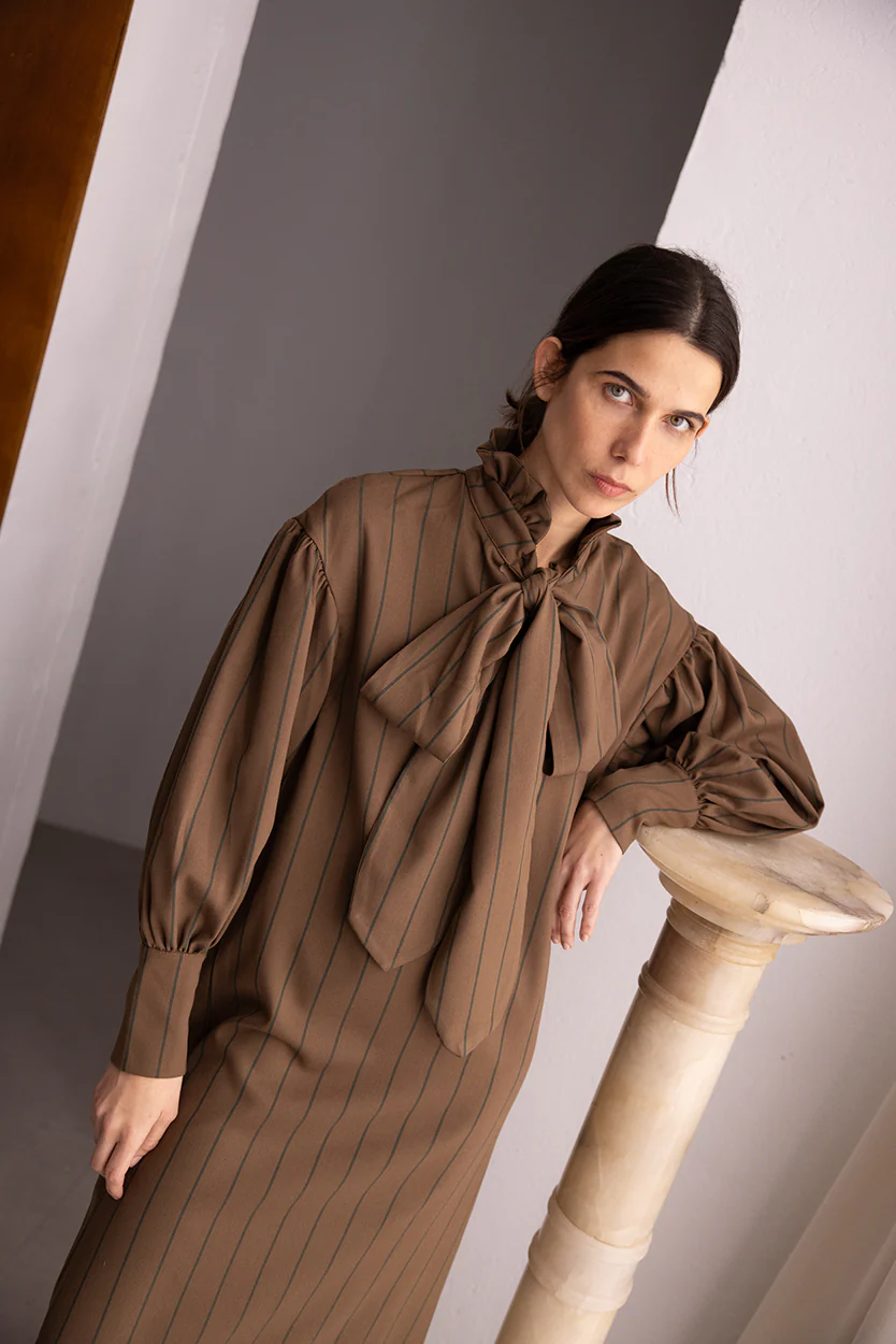 Vestido a rayas marrón. Cuello cerrado con un lazo y mangas abullonadas acabadas en puños. Este vestido se convierte en una pieza única y atemporal.