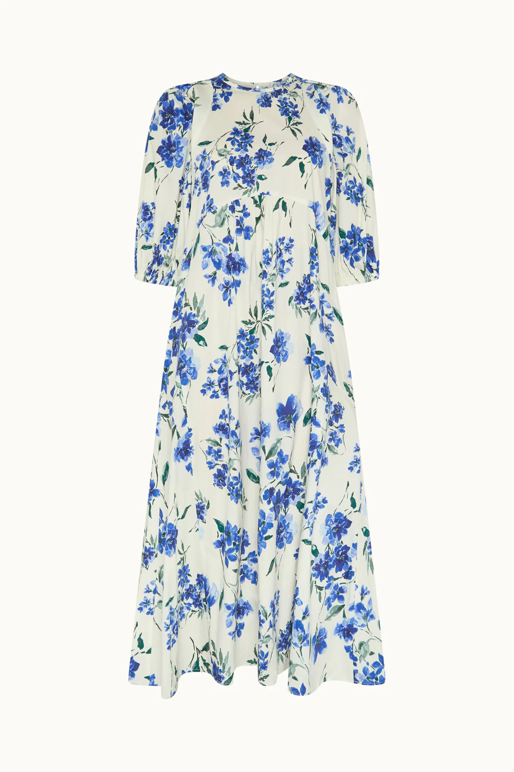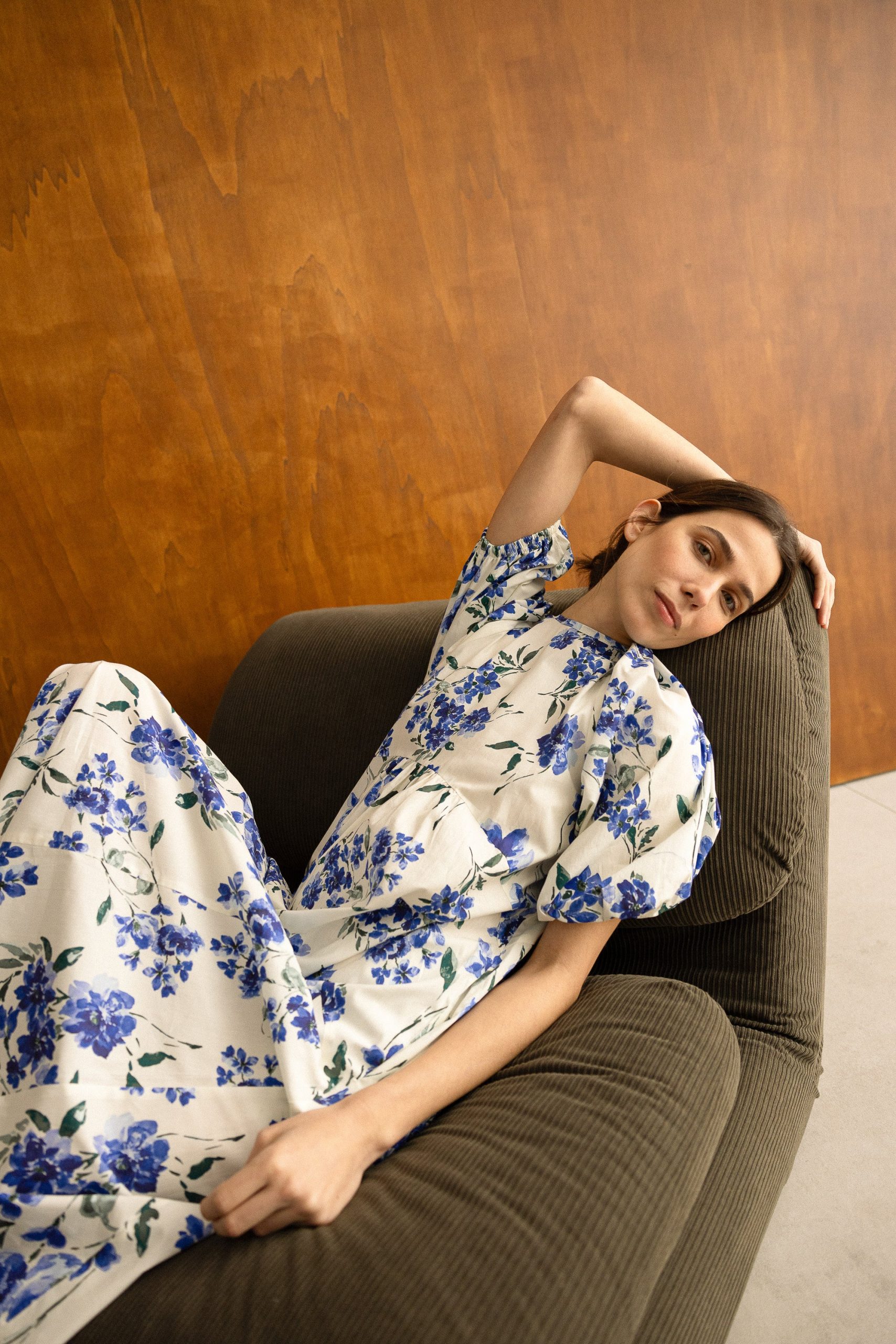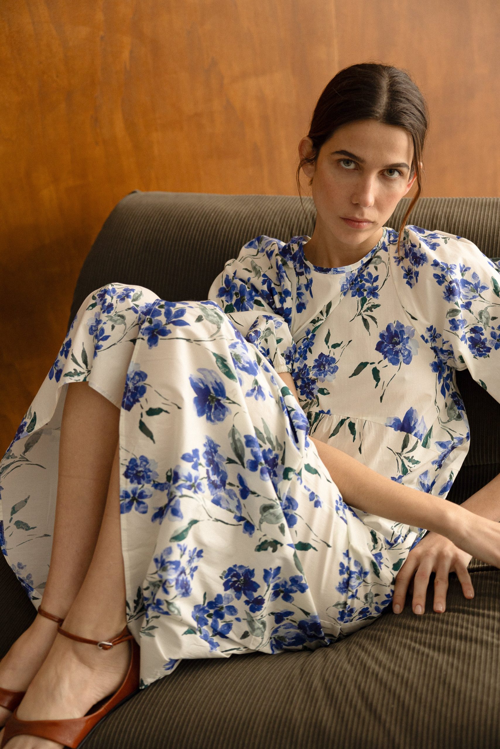 Este vestido presenta una silueta femenina, con mangas abullonadas, corte en el pecho y falda fluida. Combina la elegancia clásica con la ligereza contemporánea en una pieza que se adapta a cualquier ocasión sin perder su carácter. Confeccionado en un tejido 100% algodón con un estampado floral en blanco y azul.