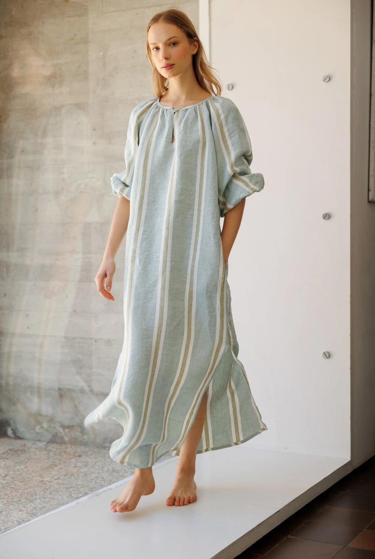 El vestido Haou de cuello redondo fruncido, mangas abullonadas y falda con doble abertura está confeccionado en un tejido de rayas verdes de lino. Con él te sentirás estilosa y guapa, y a la vez cómoda para cualquier plan de verano. Sabemos que te va a encantar.