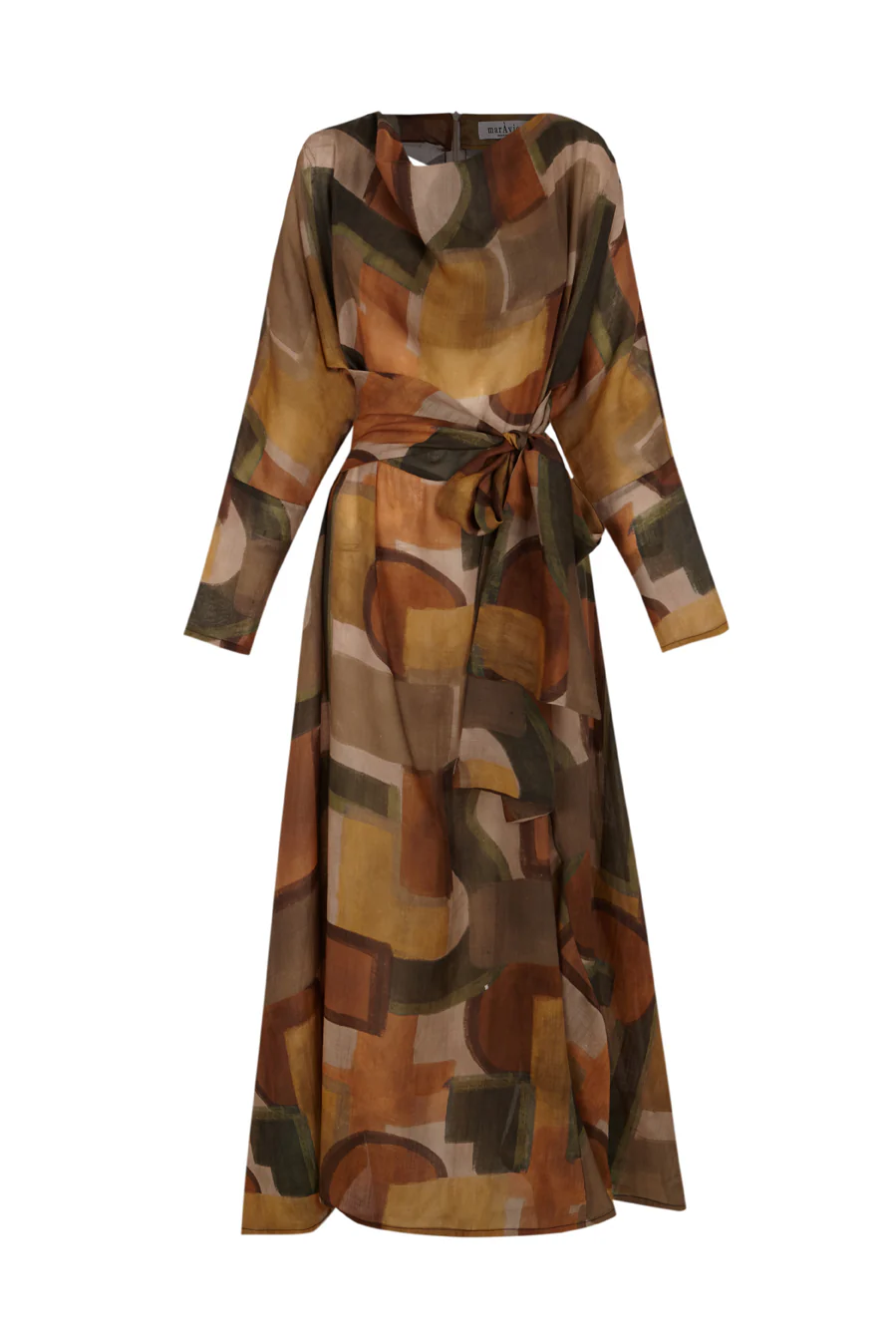 Vestido con estampado en tonos tierra. Cuello redondo drapeado. Perfecto para una ocasión especial.