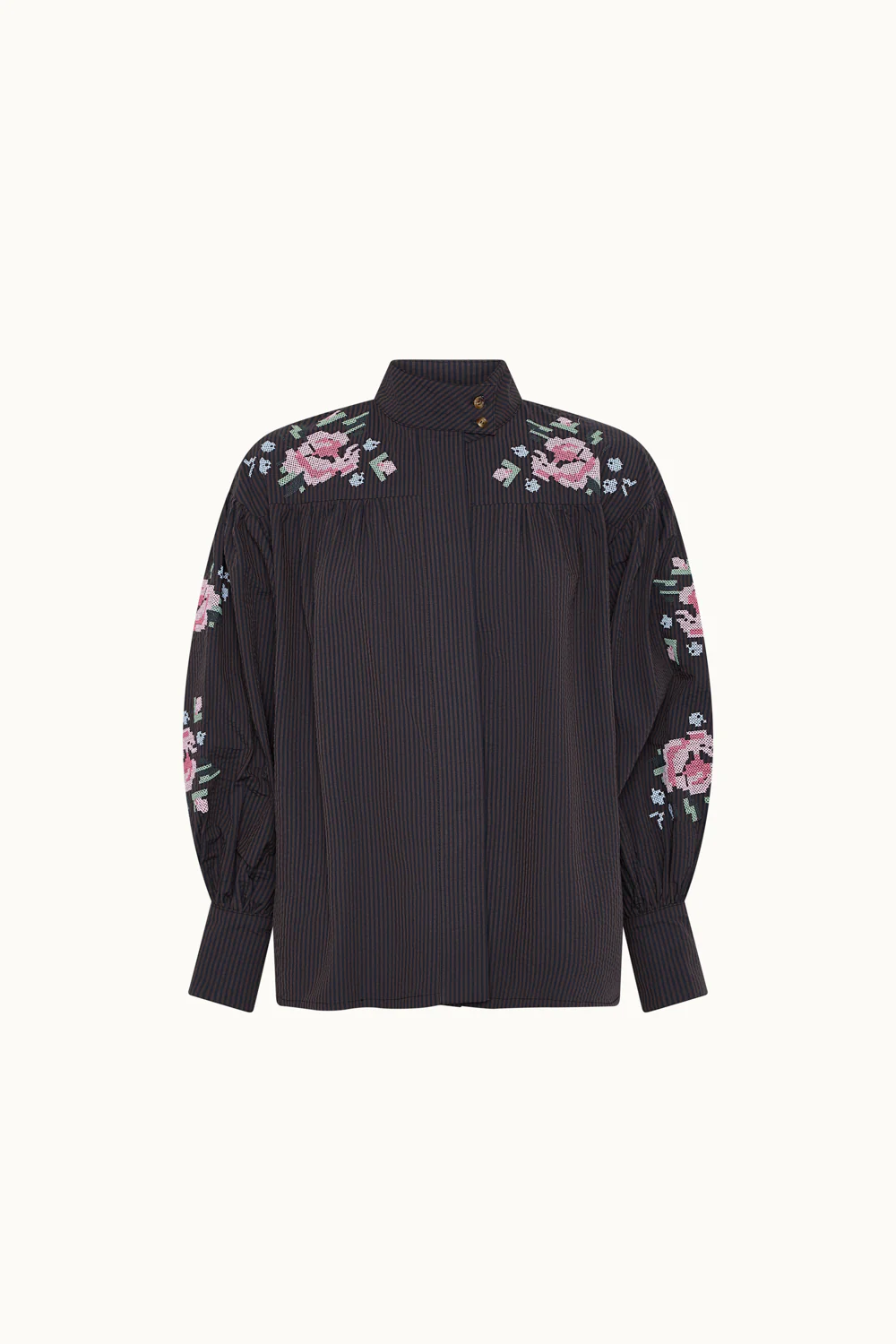 Camisa de rayas marrón confeccionada en 100% algodón. Flores bordadas en pecho y mangas. Cuello mao, mangas abullonadas y puños cerrados con botones.