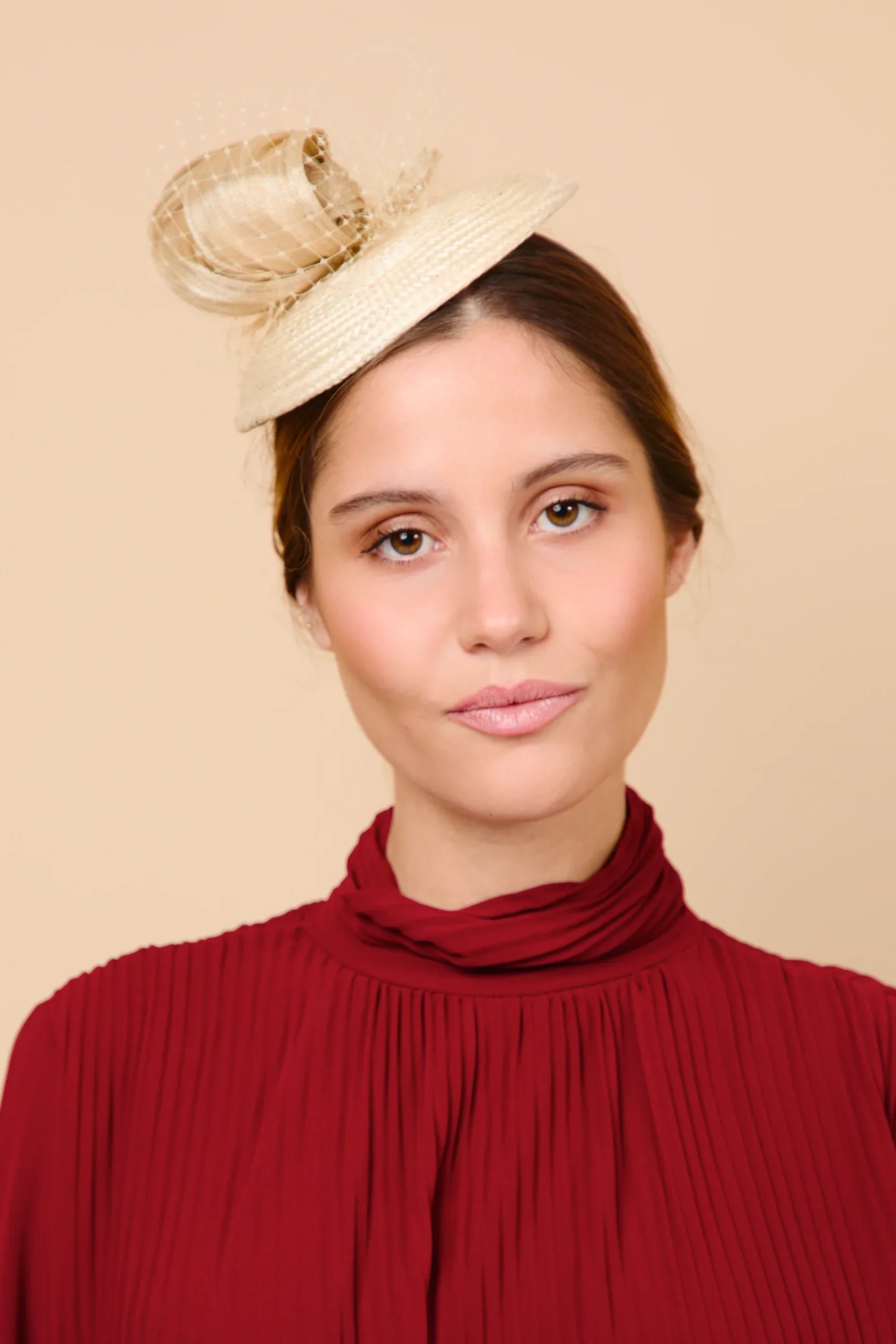 - Diseño adornado con un lazo de sinamay y redecilla, una combinación de texturas que aporta volumen, movimiento y un acabado artesanal muy cuidado.