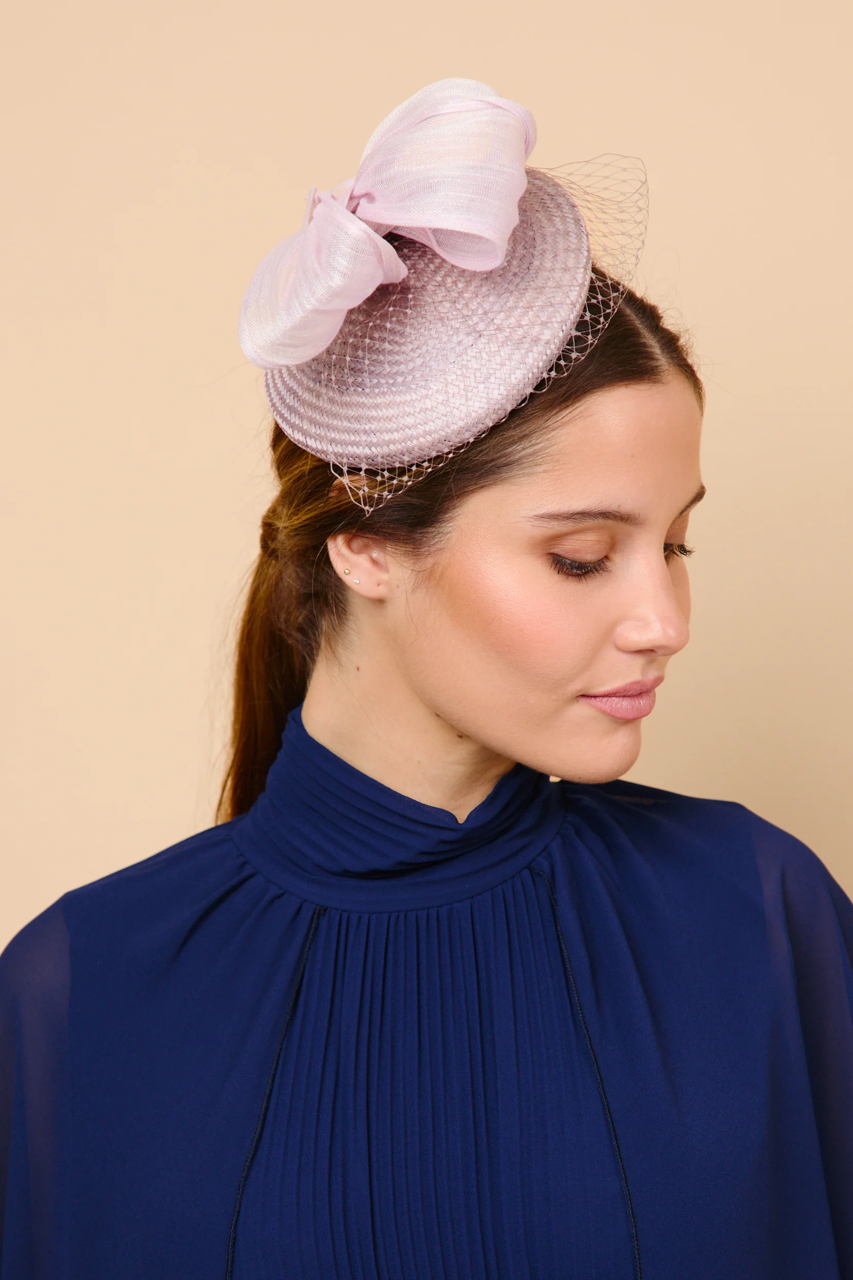 Este tocado de buntal con lazo y redecilla ofrece múltiples posibilidades para completar distintos estilismos. Algunas ideas: