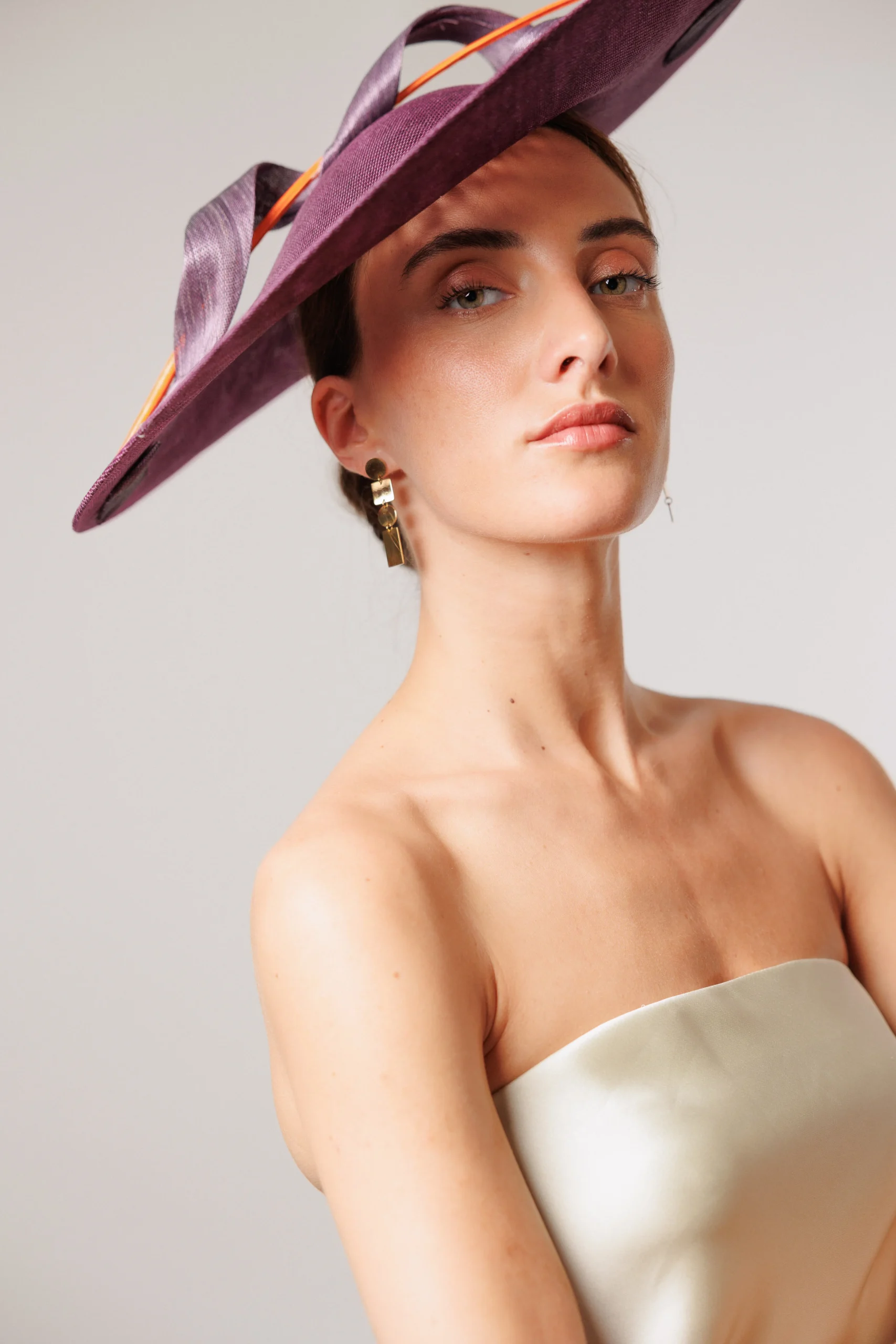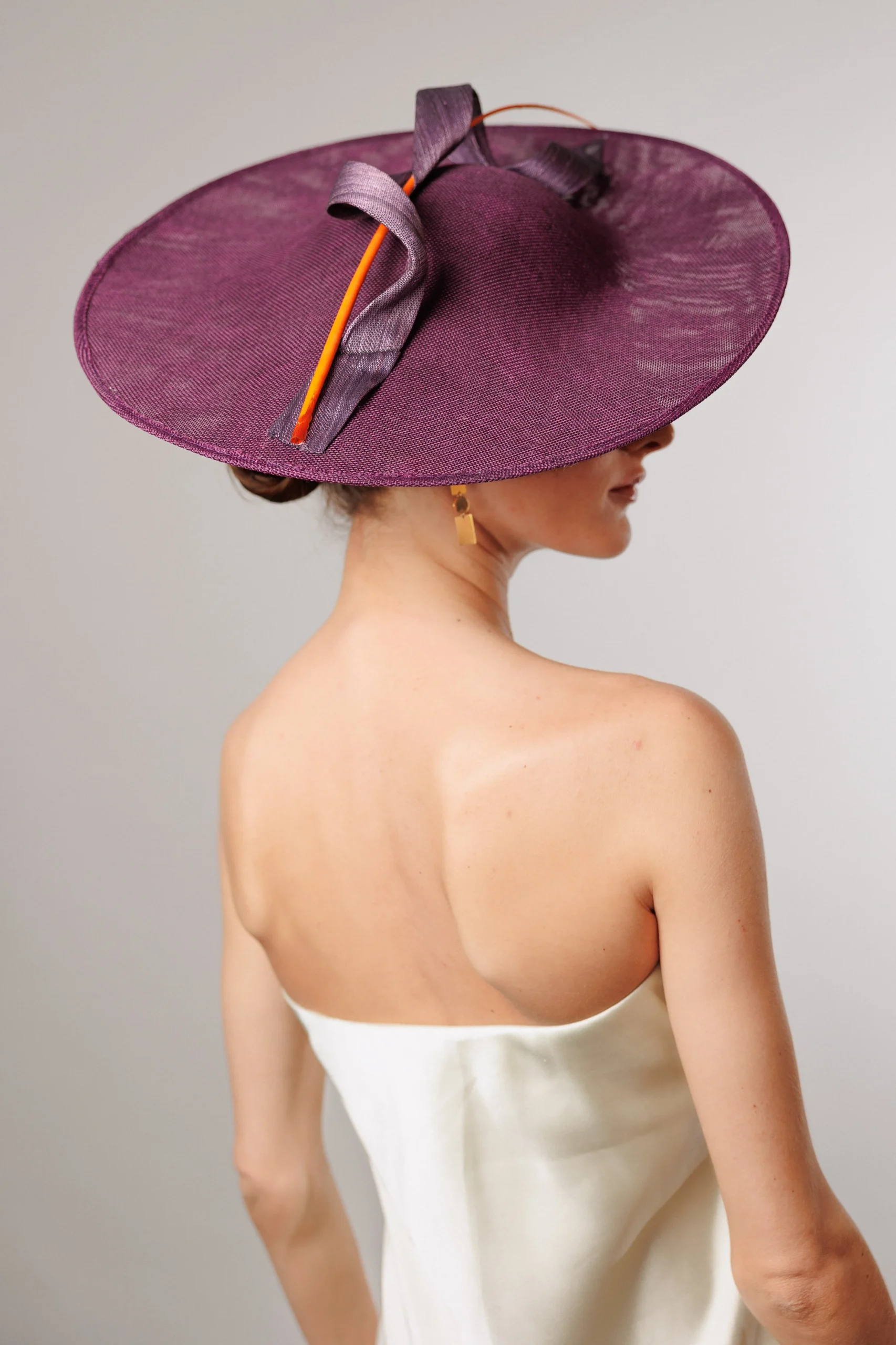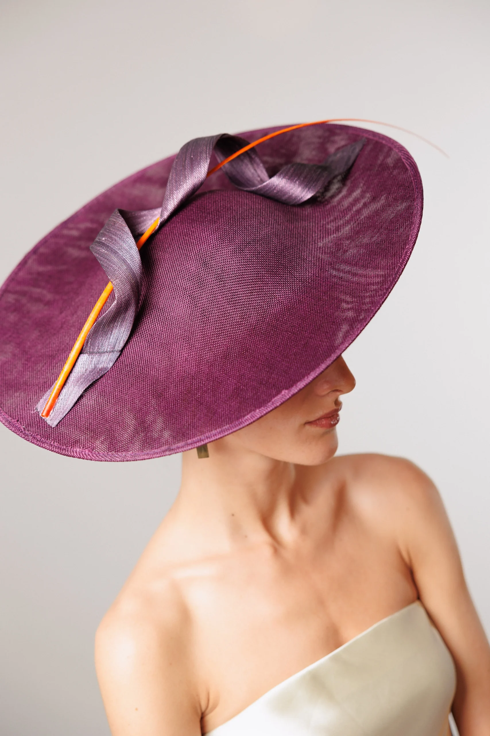 - El diseño se realza con un bucle escultórico de sinamay en contraste satinado, que aporta volumen y dinamismo, y se completa con un delicado raquis en tono naranja vibrante que atraviesa la composición, creando un efecto moderno y muy favorecedor. La combinación del berenjena con el acento naranja genera un contraste sofisticado y lleno de fuerza visual.