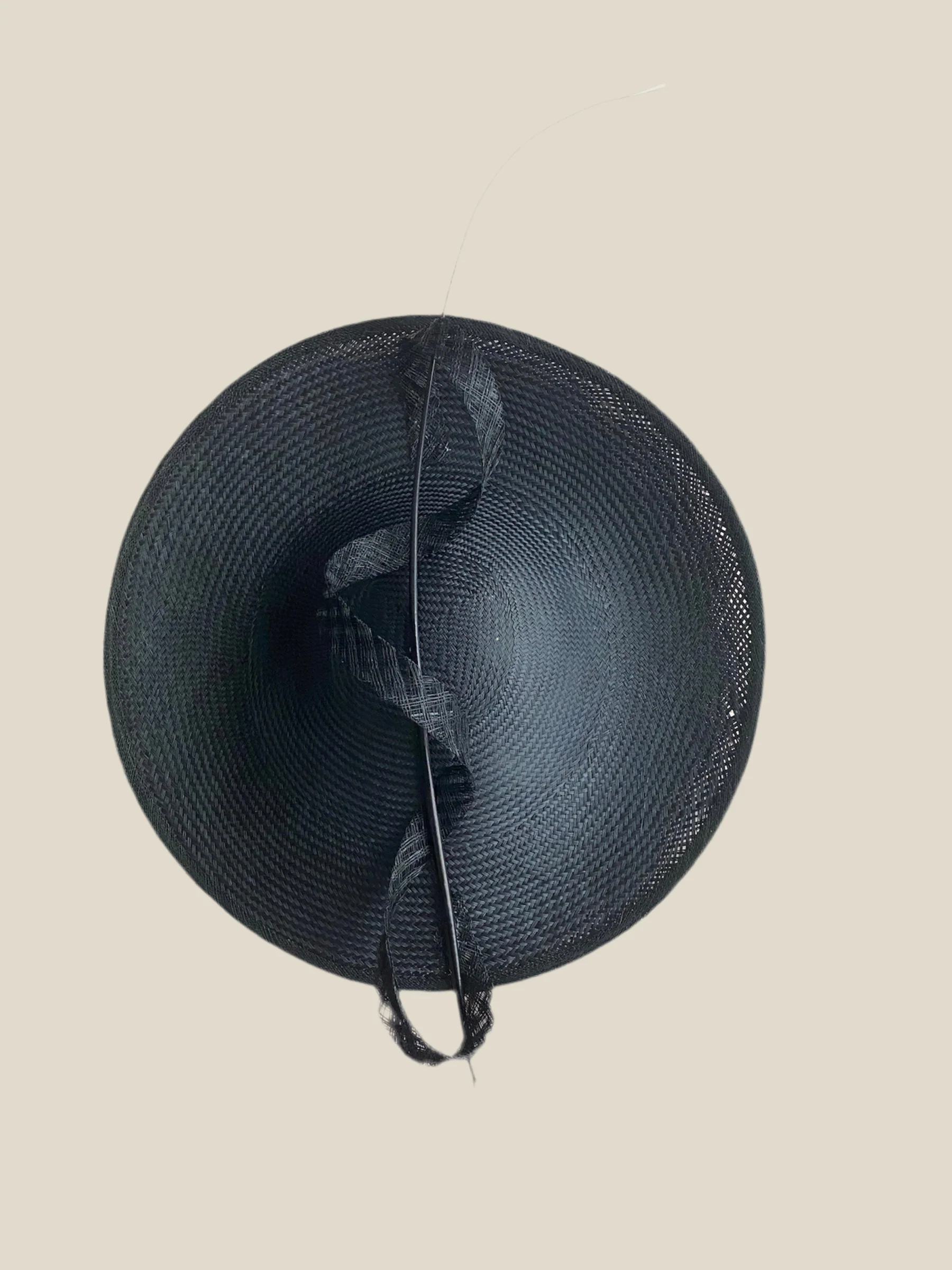 - El diseño se realza con un bucle de sinamay cuidadosamente moldeado, que aporta volumen y movimiento, creando una silueta dinámica y muy favorecedora. Se completa con un raqui que estiliza visualmente y añade un punto distintivo y refinado al conjunto.