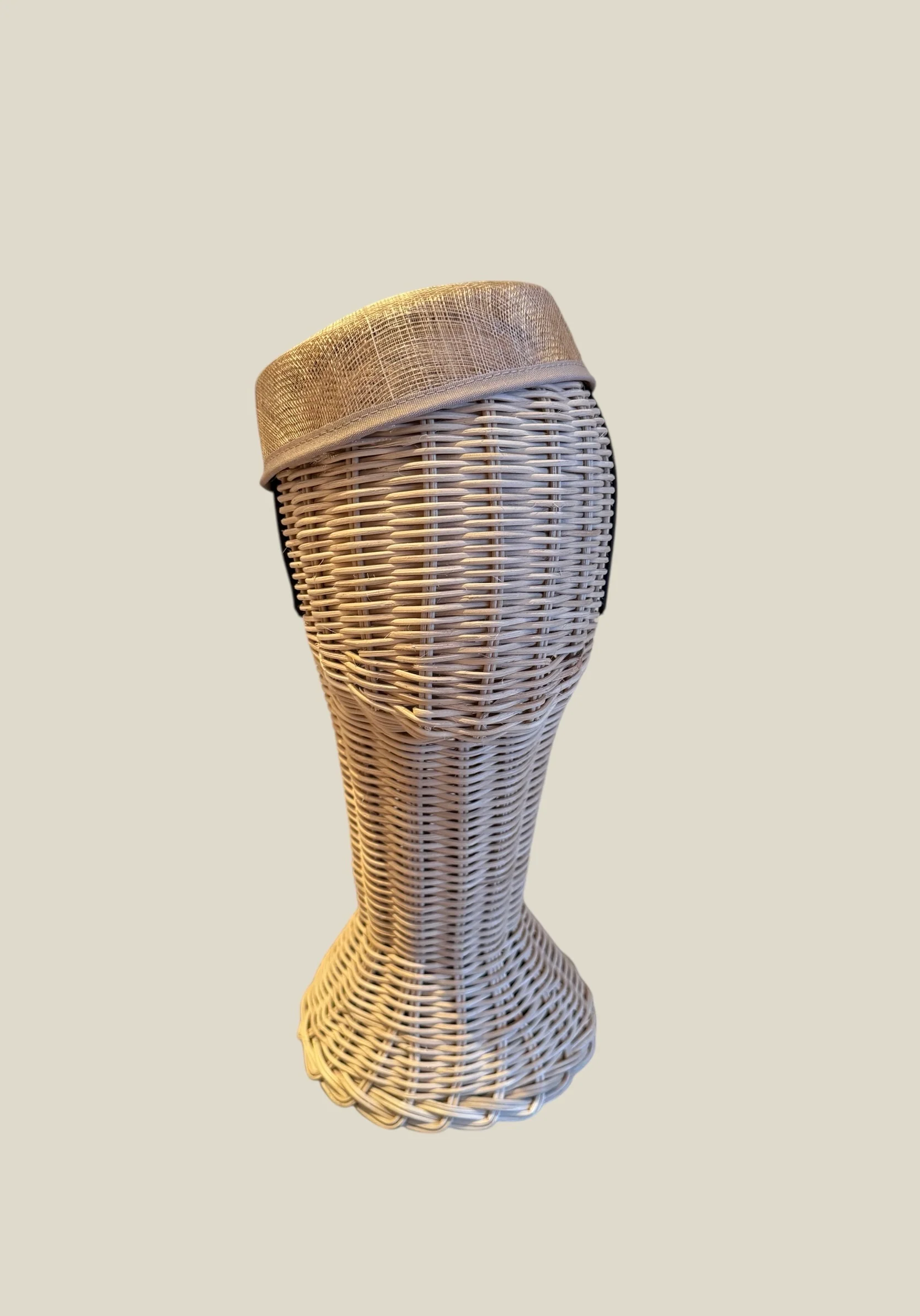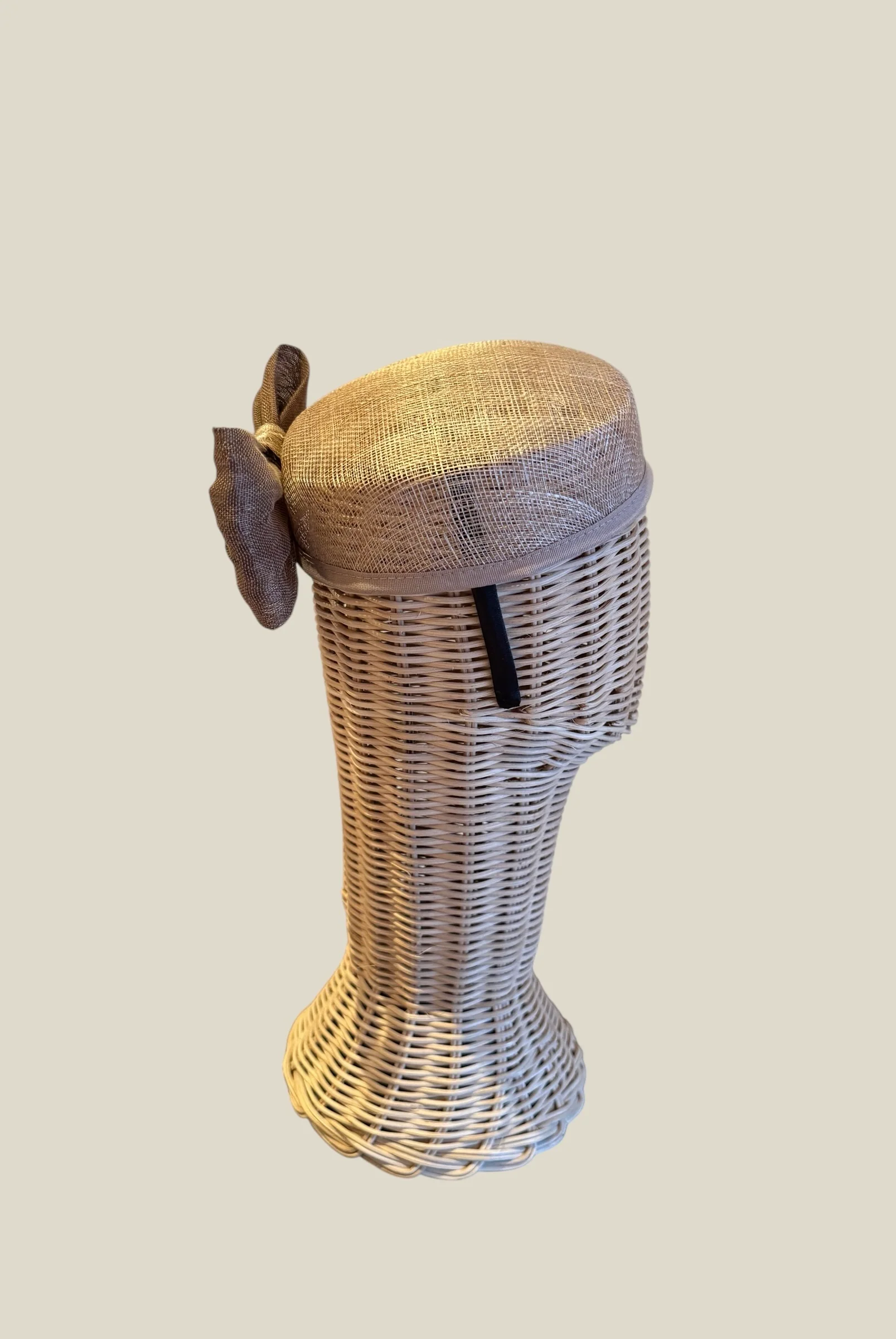 Un casquete o pillbox de sinamay adornado con un lazo delicado y montado sobre diadema, que aporta presencia y sofisticación sin perder naturalidad. Confeccionado artesanalmente en España, el tocado Carla es perfecto para bodas de día o de tarde comuniones y celebraciones donde cada detalle marca la diferencia.