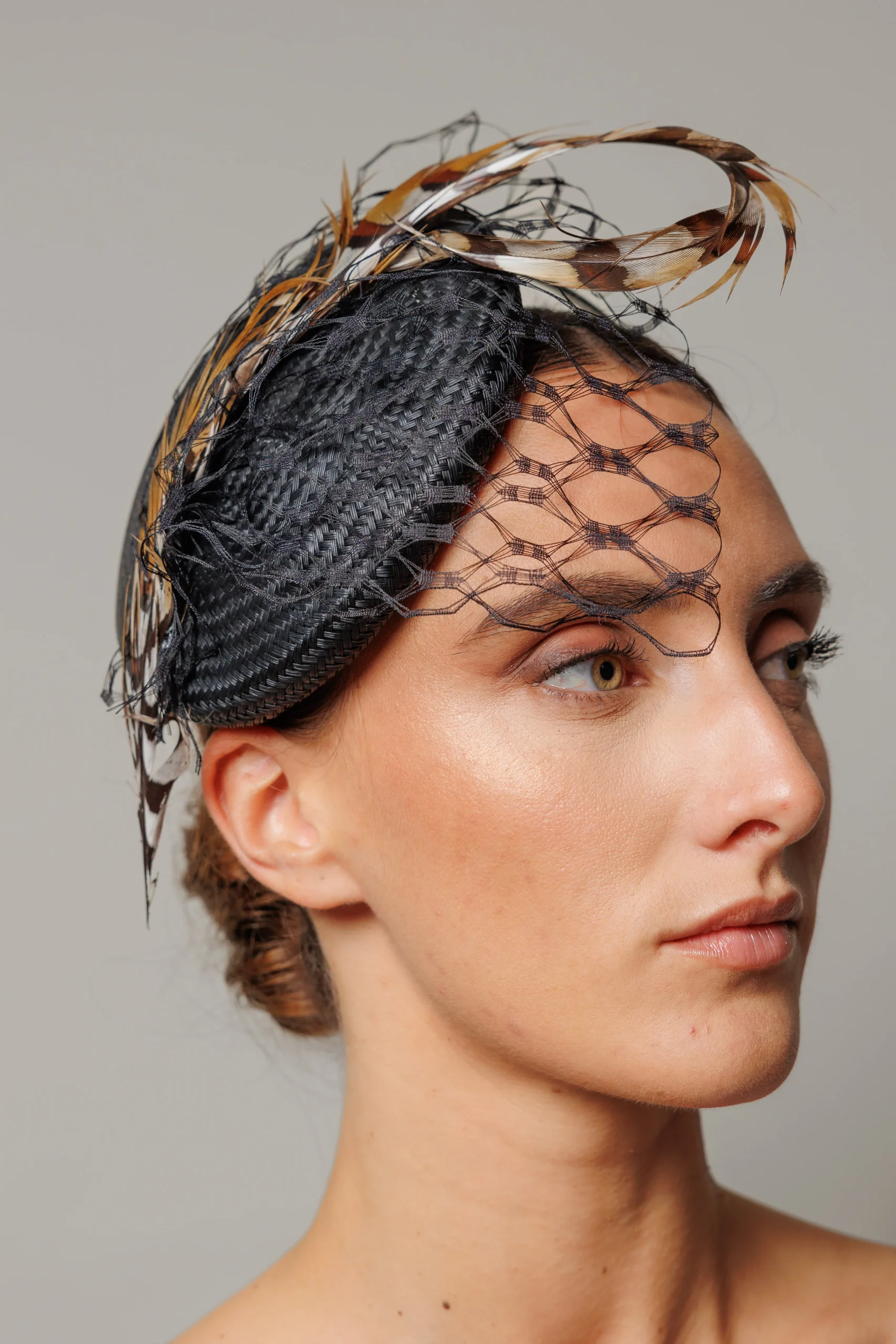 Este tocado con su base en buntal negro y el detalle de la pluma marrón, ofrece muchas posibilidades para lucir en distintas ocasiones. Algunas ideas: