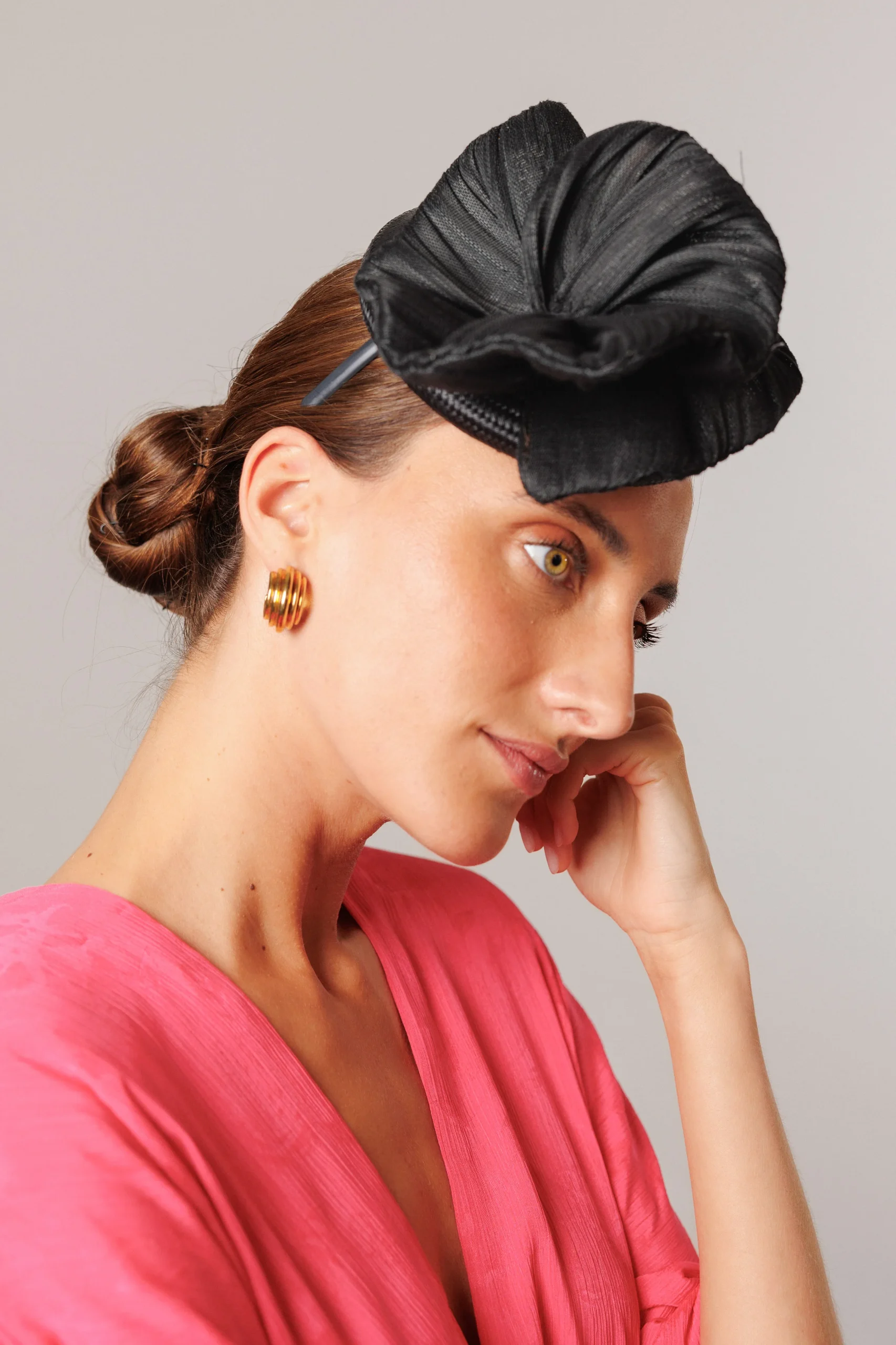 - El color negro, clásico y atemporal, convierte este tocado en una opción versátil y muy favorecedora, capaz de transformar cualquier estilismo en una propuesta refinada y bien definida.