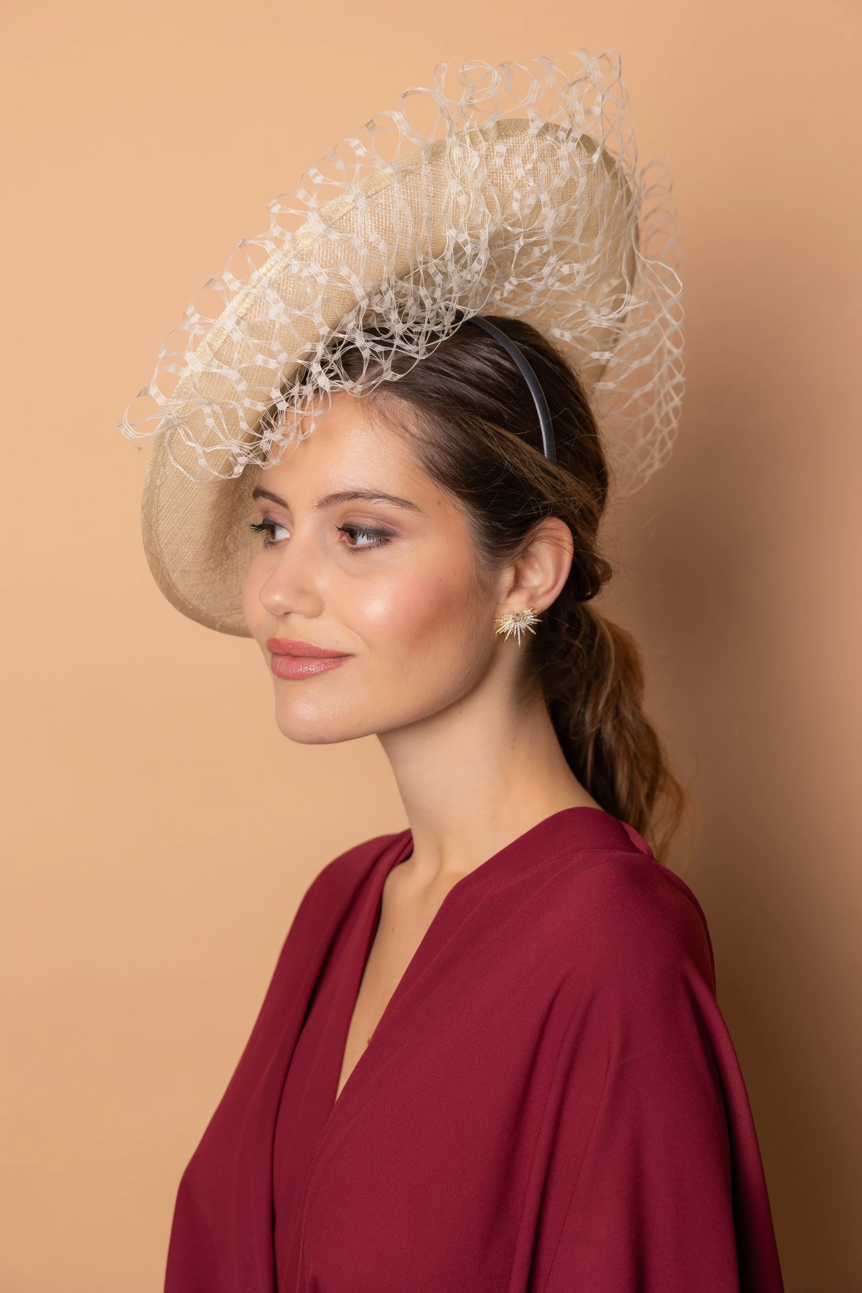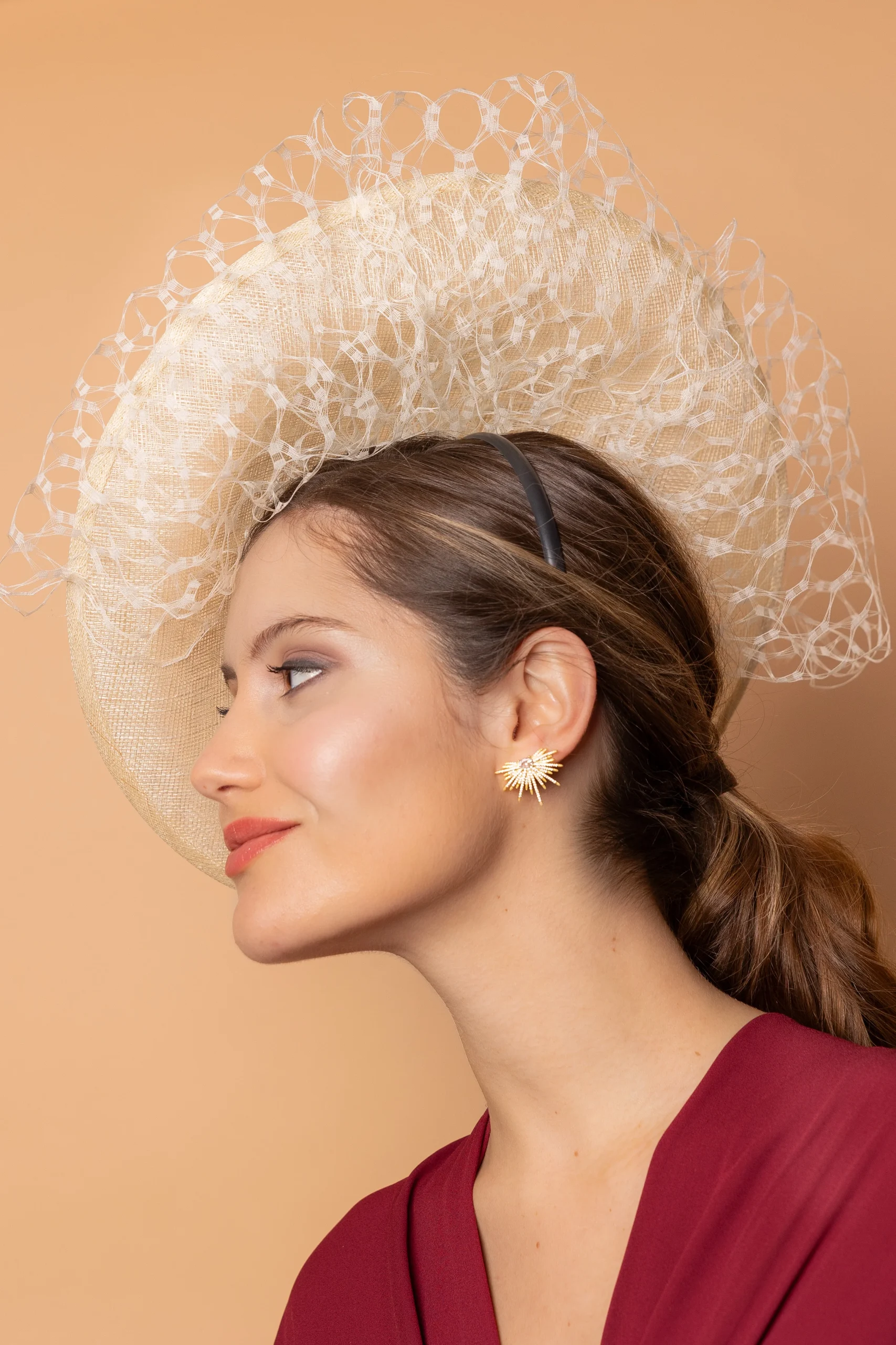 - Con un diámetro de 50 cm, este tocado aporta protagonismo y enmarca el rostro de forma favorecedora, convirtiéndose en un complemento distinguido y con carácter.