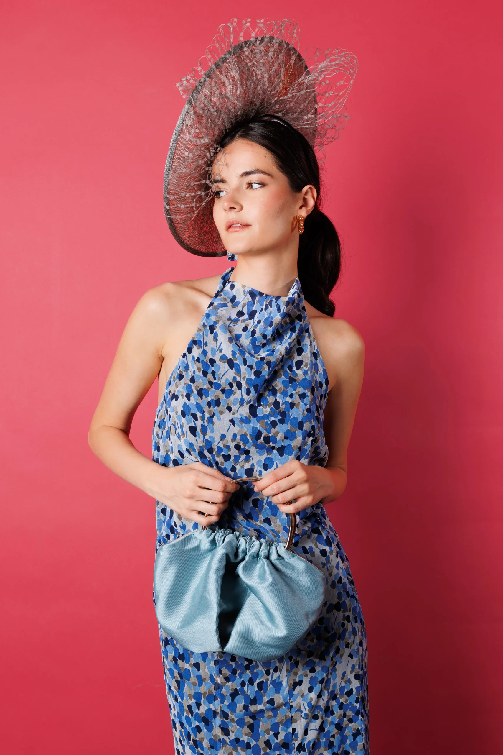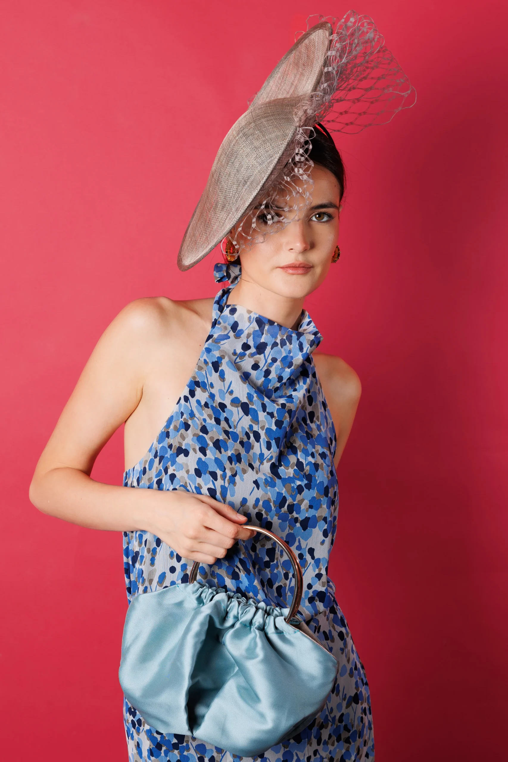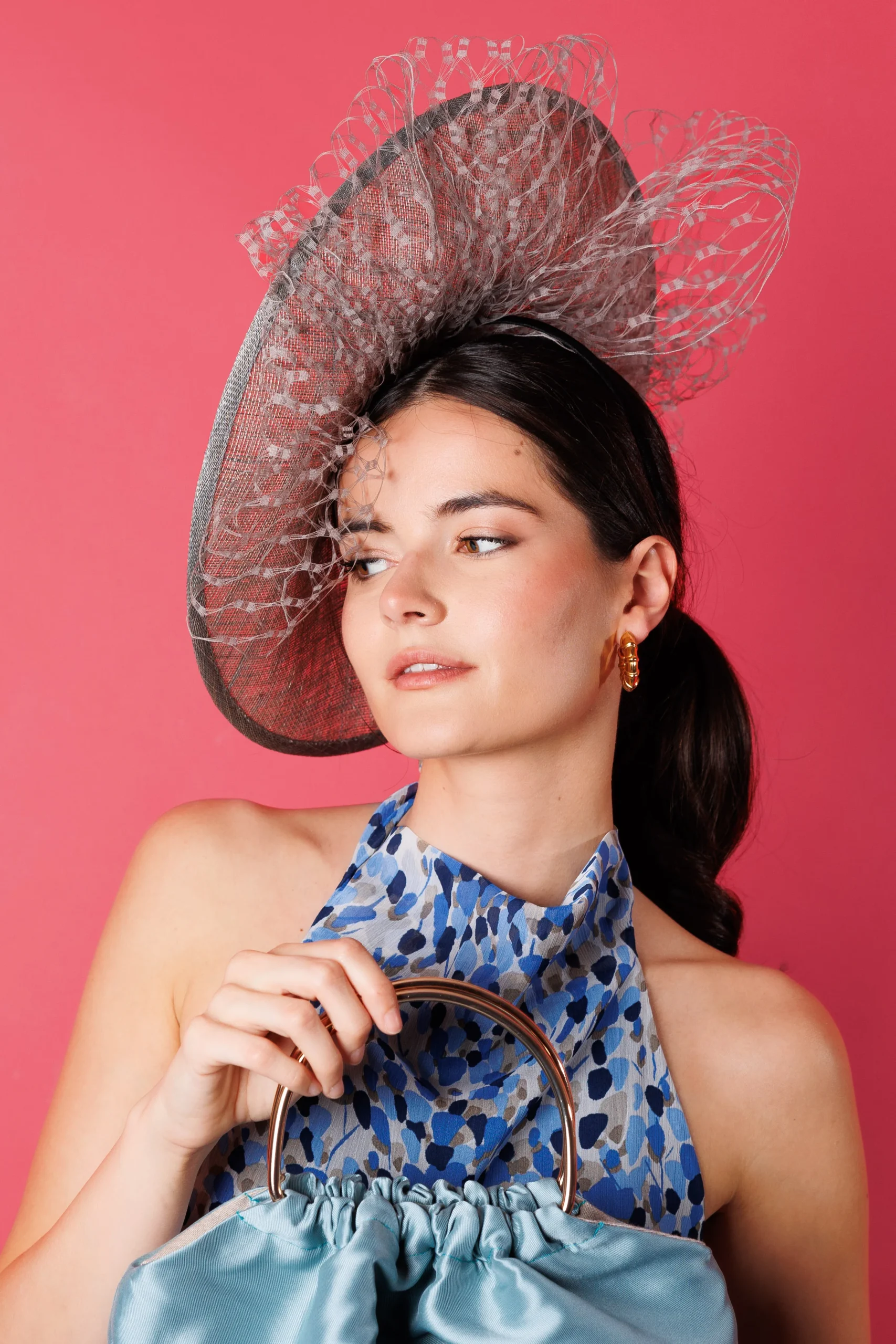 - Con un diámetro de 50 cm, este tocado aporta protagonismo y enmarca el rostro de forma favorecedora, convirtiéndose en un complemento distinguido y con carácter.
