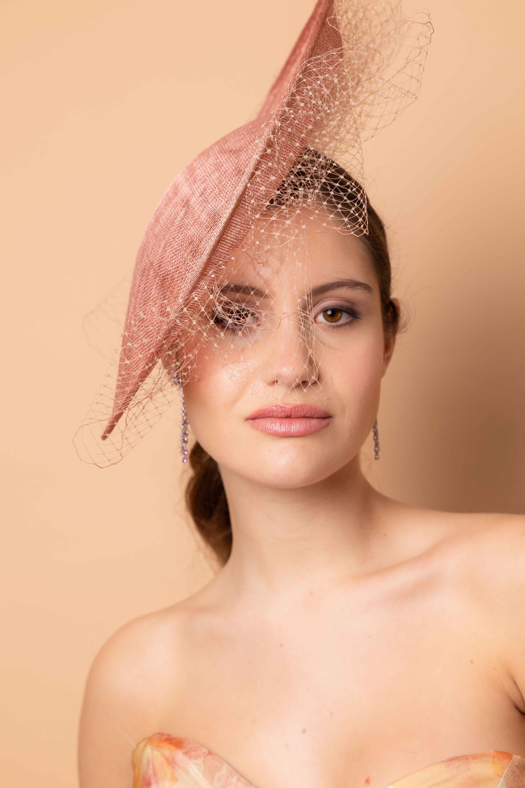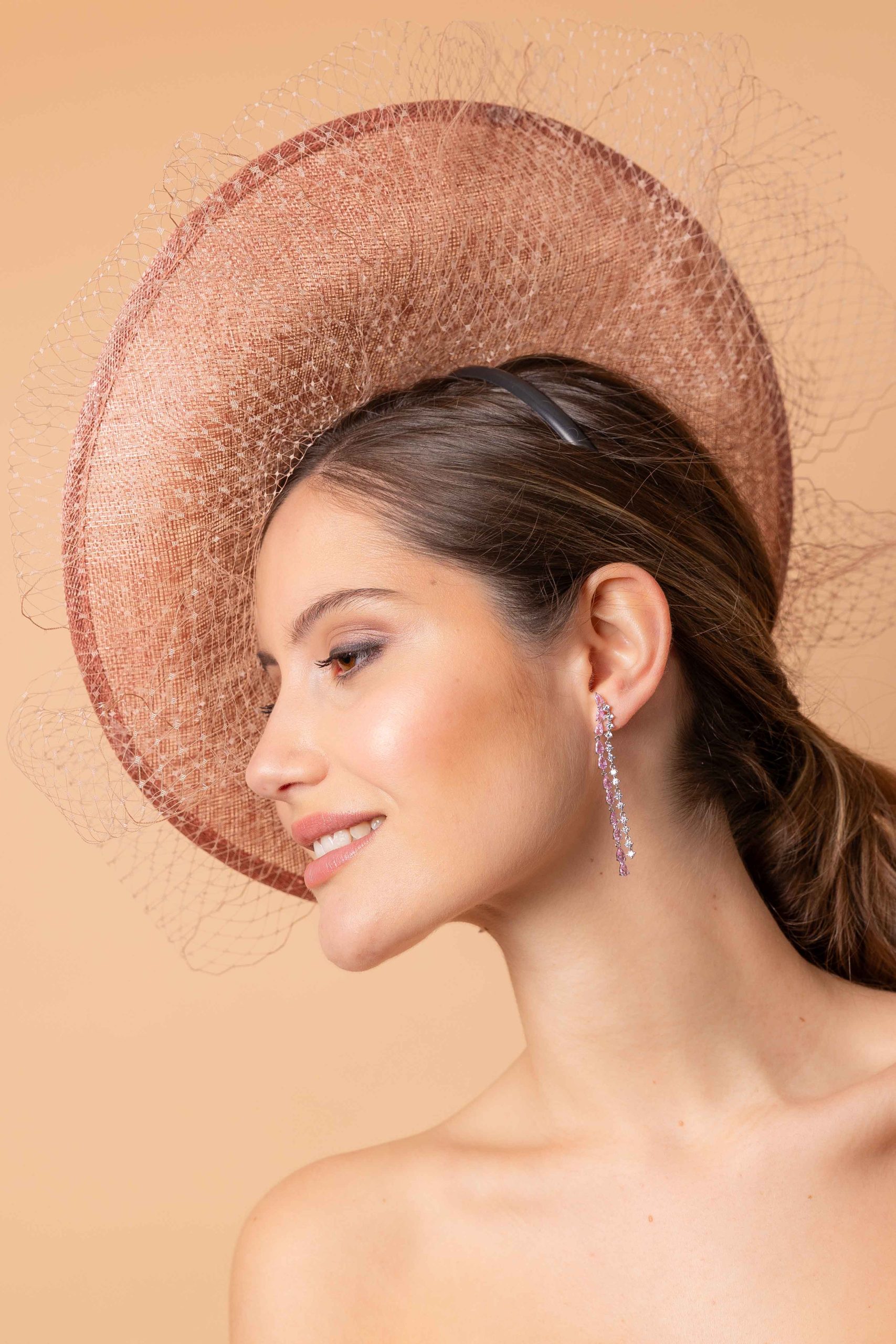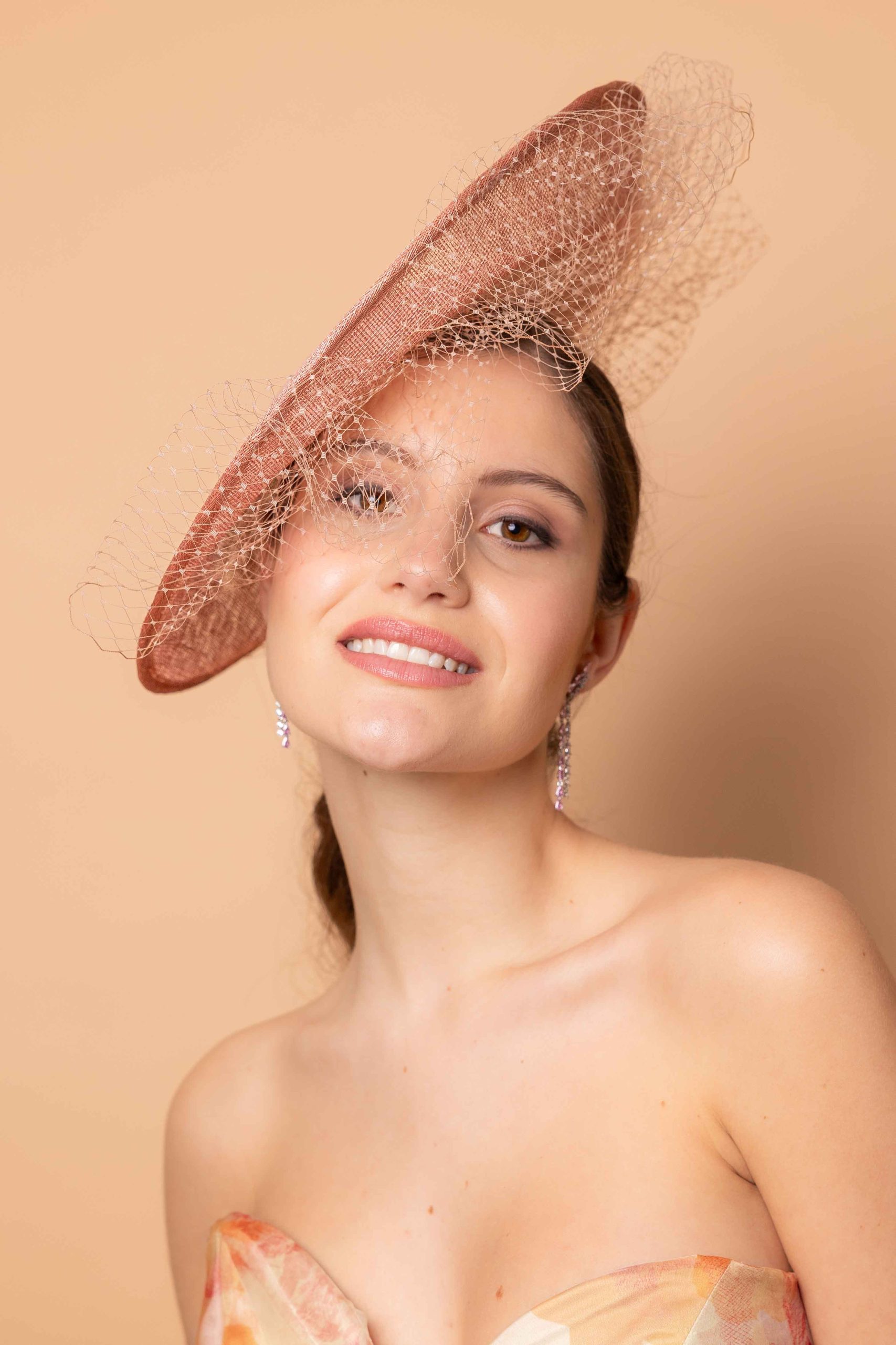 - Con un diámetro de 50 cm, este tocado aporta protagonismo y enmarca el rostro de forma favorecedora, convirtiéndose en un complemento distinguido y con carácter.