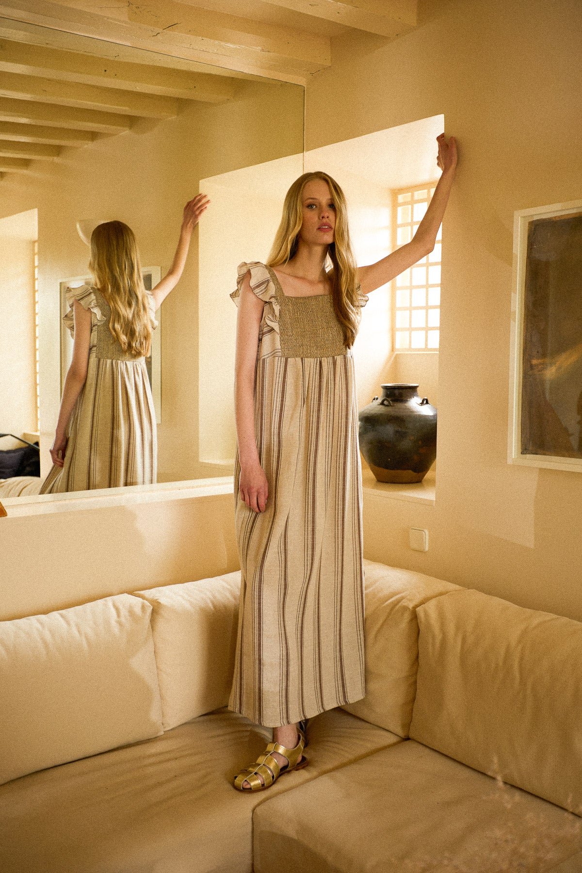 Vestido confeccionado en un tejido bordado combinado con un lino a rayas beige. Es un vestido largo sin mangas con escote cuadrado, dos volantes fruncidos y falda con dos aberturas laterales.